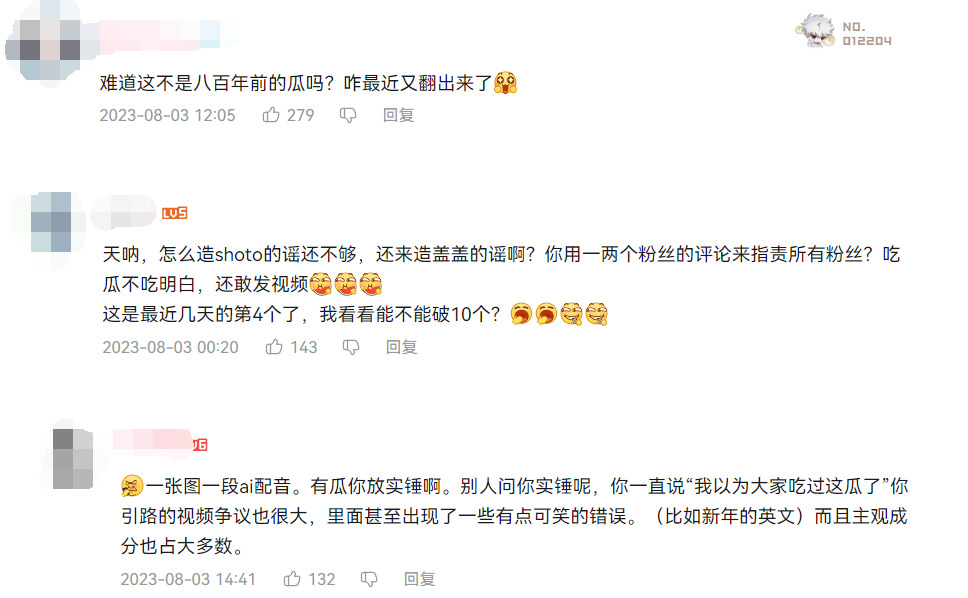 其实在最近这件事重新被搬到公众视线之前,也有不少up主自发做了这场录播相关的吃瓜评论视频,而在当时的那些视频里,我们能看到大部分粉丝的画风是这样的↓