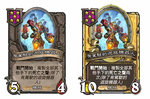- 效果重做为“对战开始时:复制所有其他随从的亡语(除了载人飓风机甲的)”(由战吼复制目标亡语重做)
