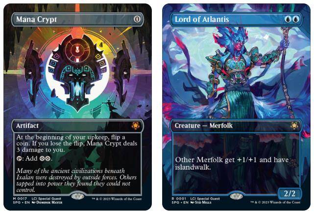 自依夏兰迷窟起,我们将推出名为“特殊来宾”的牌。本系列为这些大师级重印牌设计了新的插画并添加了预兆路各处的元素,针对依夏兰迷窟产品预览,我们提前公布以下两张牌:魔法力墓穴和亚特兰提斯领主。