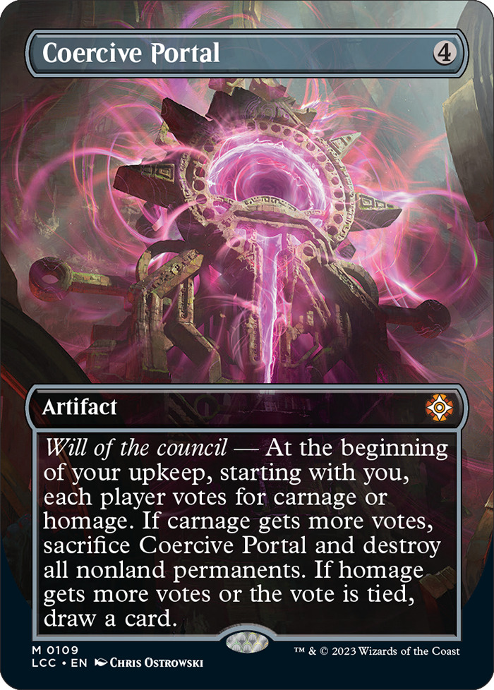 这种特殊的闪牌绘有夺人眼球的插画,在闪处理的映衬下闪着耀眼的霓虹光芒。喜爱神河霓朝纪的牌手想必不会忘记,该系列的闪版噬生浑魔碑出告采用了同样的霓虹墨绘处理,视觉上颇具美感。