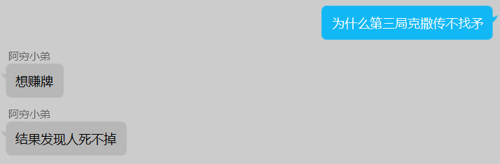第三局后手的起手,接了一个比较完美的后手防守手牌,有闪电击、怒火、灼烫毒蛇的起手,对方2回合克撒传3回合维克族祝圣僧,我直接带上痛苦面具,直呼我爹来揍我屁股了,根本解不掉,然后克撒传第3章找了个夹子,轻脚贴上帷幕皮和我对看,圣僧开始和我对踢, 在我头疼之际,想到了破局的一手,用毒蛇的历险吹掉了轻脚的帷幕皮,用手中的怒火清干净了对方的场面,只留下圣僧一人孤家寡人,对面和我对踢几回合被我三枪站稳斩杀,后来问为什么不找矛的时候,得到了毛兔兔如下的回答