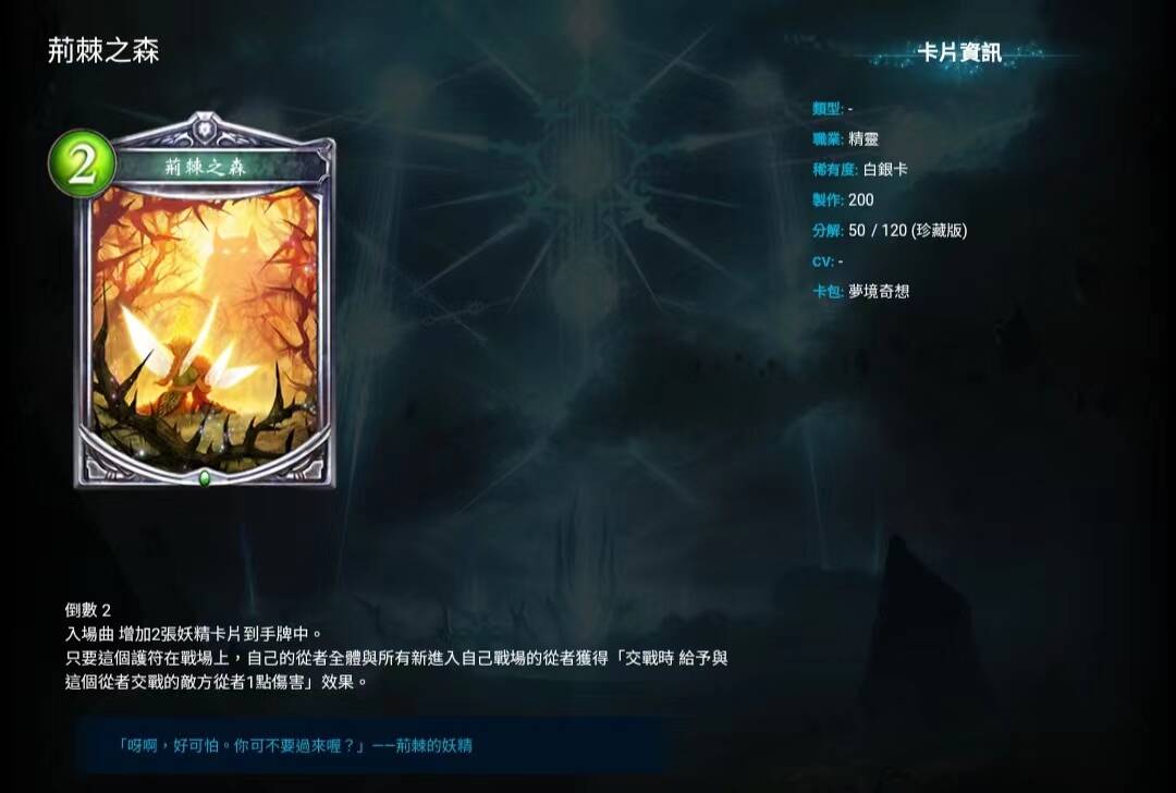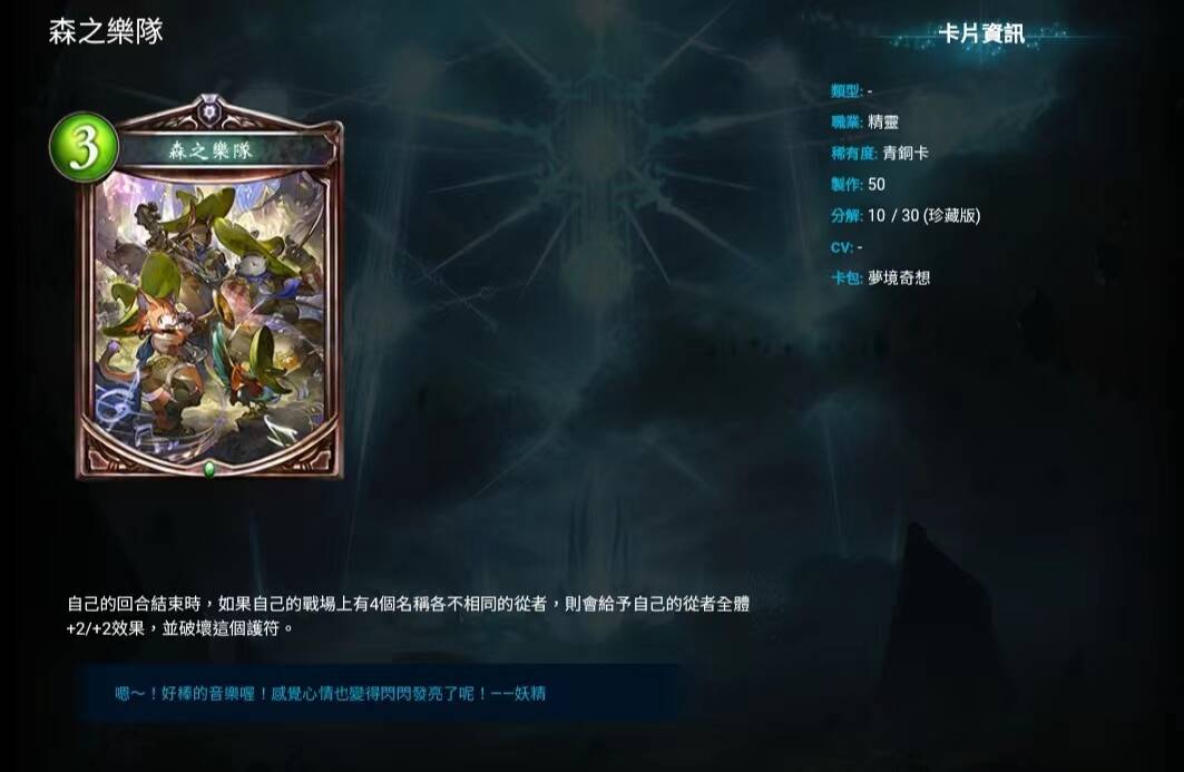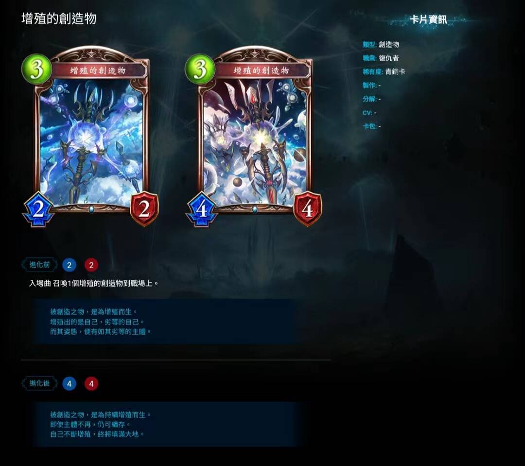 入场曲 如果「自己在这场对战中增加到牌堆的创造物随从卡」为5张以下,则会增加2张增殖的创造物卡片到牌堆中,使其全数消费转变为1。如果为6以上,则会增加2张迅袭的创造物卡片到牌堆中,使其全数消费转变为1。回复自己的能量点1点。