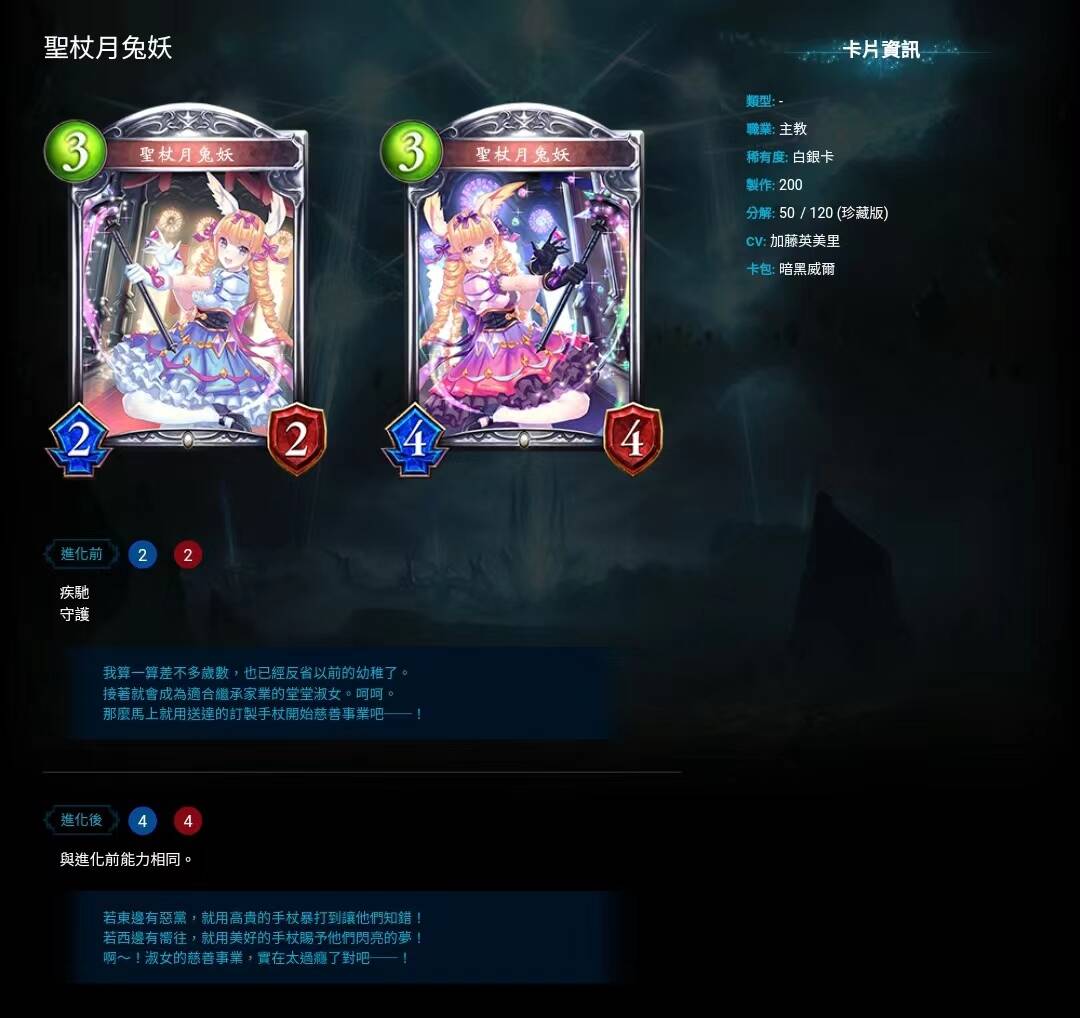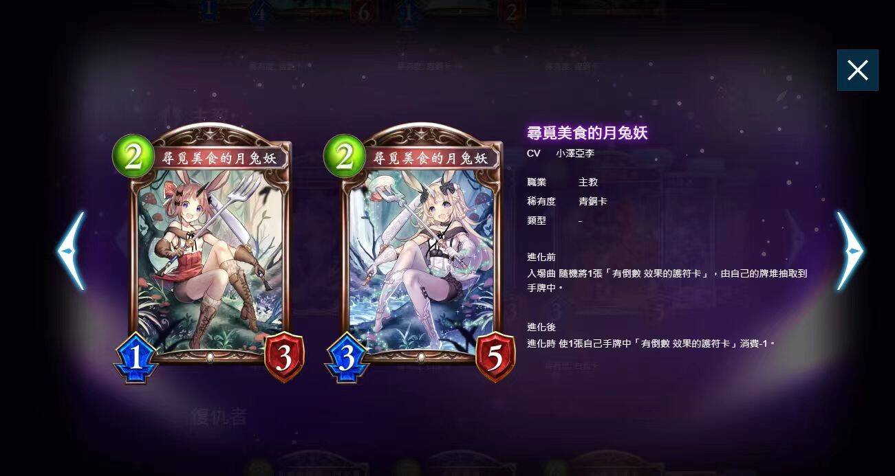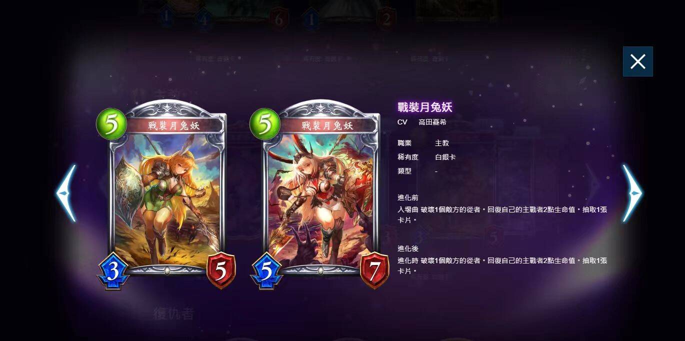 自己的随从进化时,召唤1个圣杖月兔妖到战场上。此效果每个自己的回合仅限发动1次。