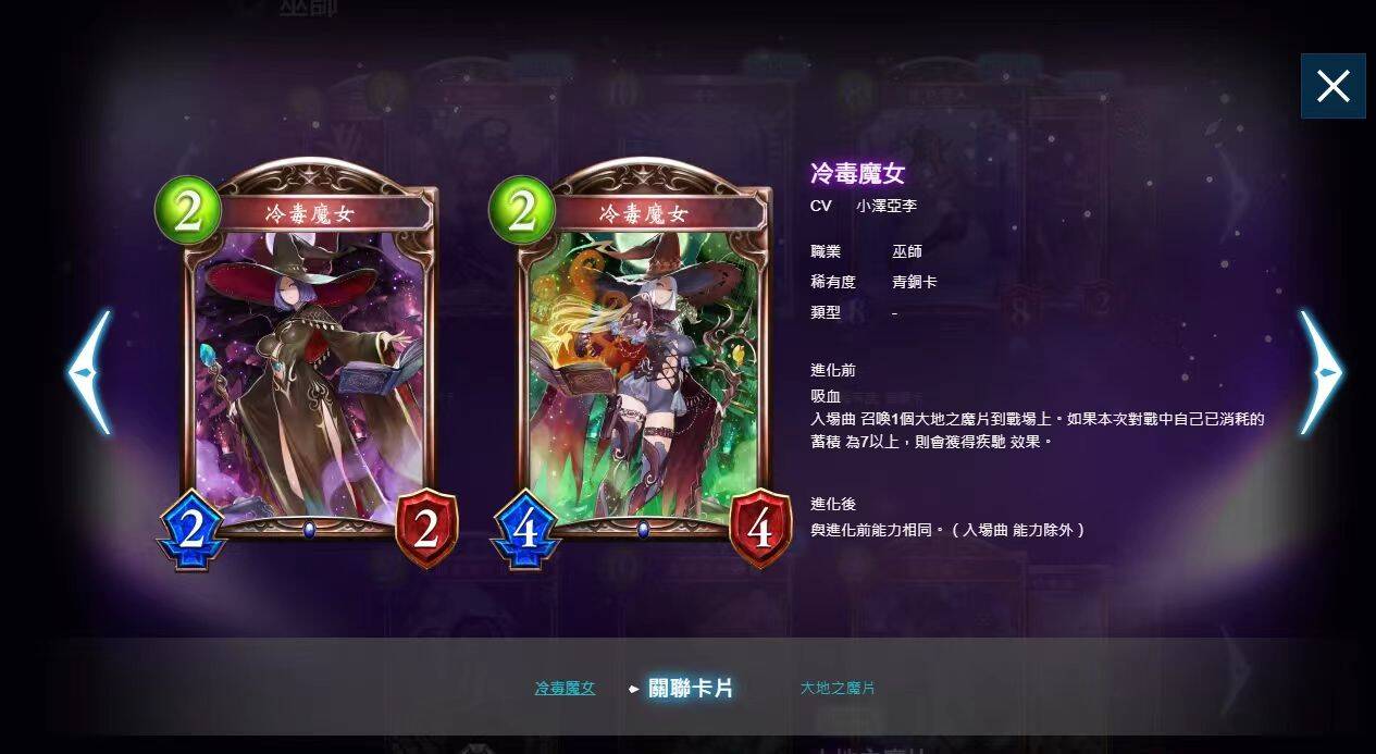 进化时 召唤1个水银魔女到战场上。如果自己剩余的能量点在3以上,则会消耗自己的能量点3点,并由原本的1个转变为2个。