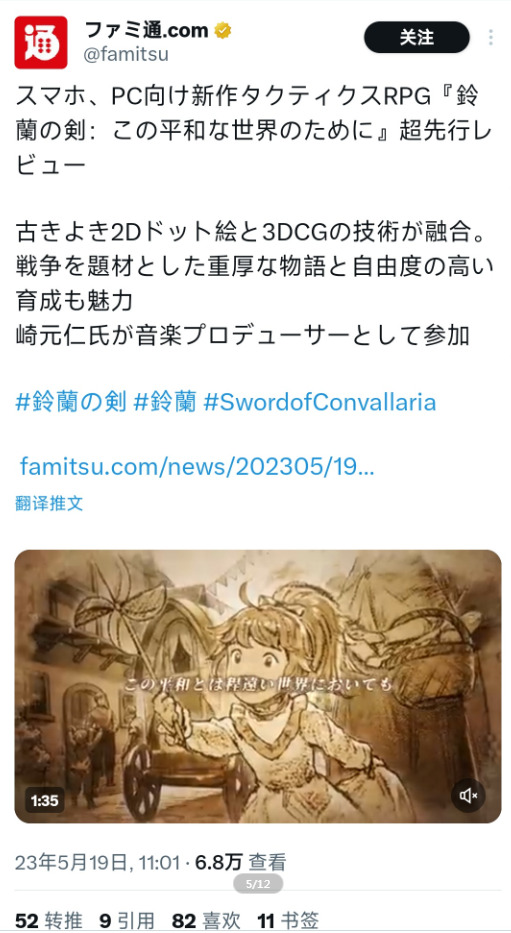 这其实并非是松野泰己乃至日本游戏界第一次关注到《铃兰之剑》。早在两年前游戏正封闭测试时,松野泰己就在自己高强度直播《FF14》下本进度的推特上推荐了这款游戏。松野称赞这款游戏“美术细致、战斗节奏很好”,并且直接表示希望游戏发售日语版本。可以说松野泰己本身就是游戏最早的自来水。