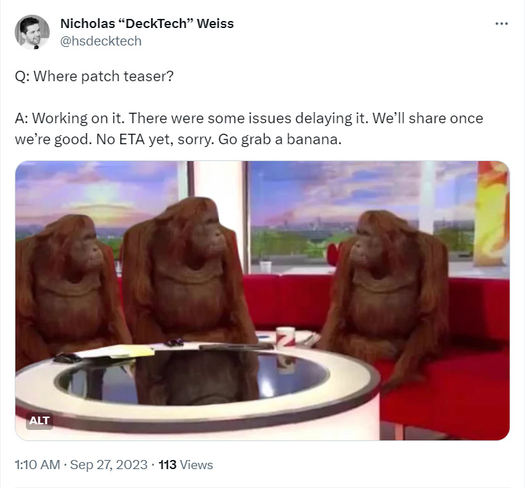 千呼万唤始出——不,没有出来,按惯例平衡补丁上线之前会在周三凌晨有图示先行发布,结果这次等来的只是预告的延误通知。除了确认延误和“还在做”以外,DeckTech没给出其他任何信息,也没说什么时候发(甚至发不发),事实上一整晚下来都没有新消息。