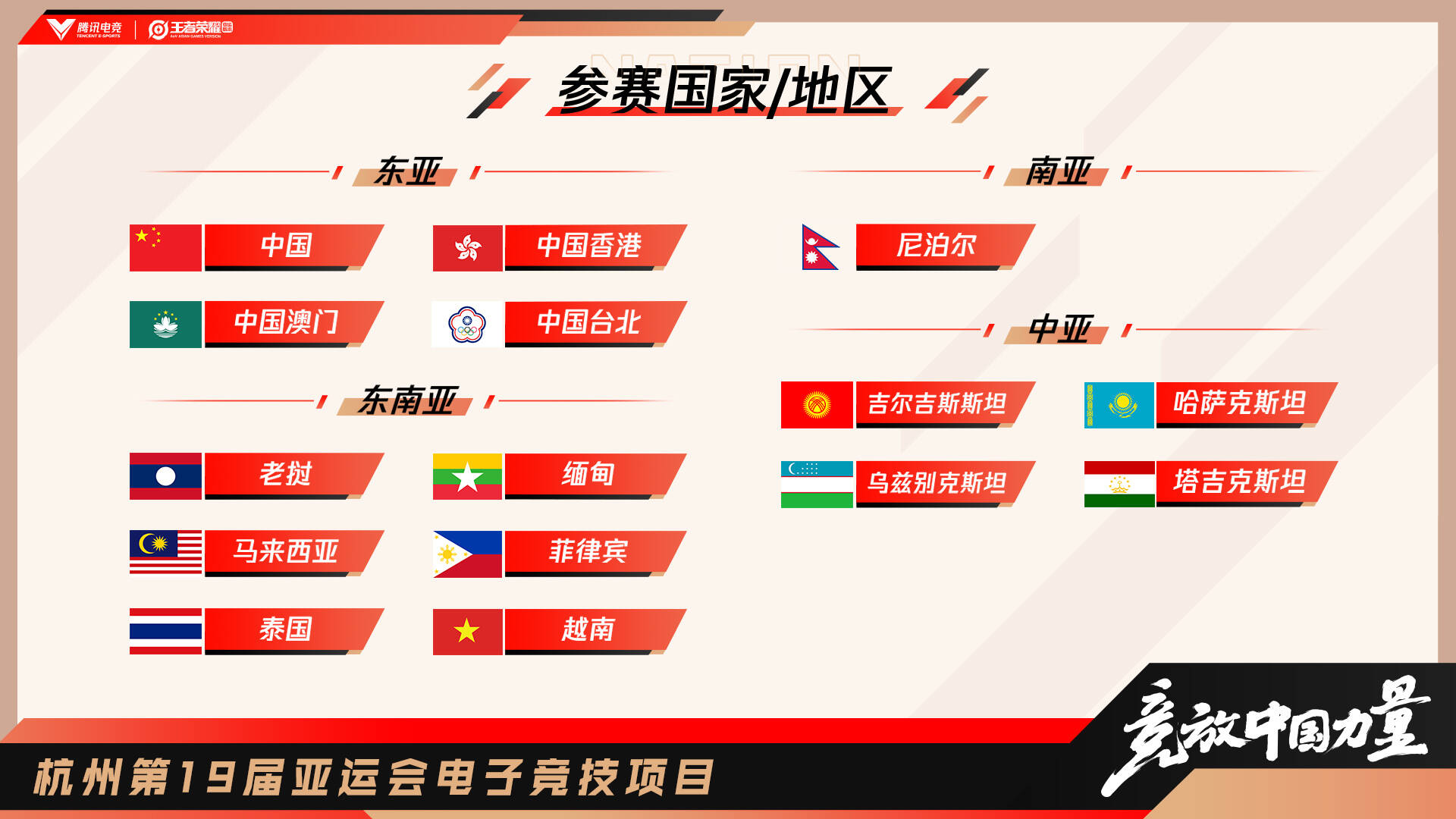 本次王者荣耀亚运版本项目共有来自 15个国家和地区的队伍前往杭州参与本次盛会,包括:中国、中国香港、中国澳门、中国台北、老挝、缅甸、马来西亚、菲律宾、泰国、越南、尼泊尔、吉尔吉斯斯坦、哈萨克斯坦、乌兹别克斯坦、塔吉克斯坦。马来西亚获得银牌、泰国获得铜牌。