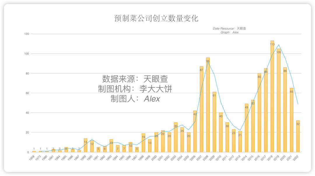 这个风口之下,自然人人都想进来分一杯羹,就比如陆正耀,离开瑞幸后的第二个项目,就是搞预制菜。根据隔壁知危的图表,也能非常清楚地看到相关公司数量的两次暴涨。