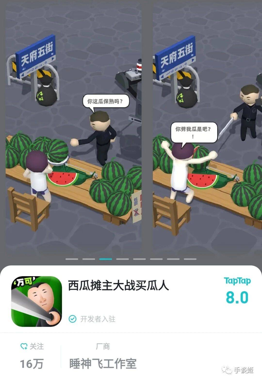 应该是看中了这股热度,睡神飞便做了一款休闲塔防游戏,名叫《西瓜摊主大战买瓜人》。虽然游戏里没有点名实际人物,但明眼人都知道在暗示什么,而且游戏里加入了电视剧的部分语音。