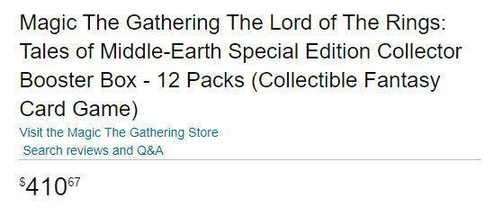 特别版聚珍补充包一盒(12包)的售价目前在亚马逊显示为410美元一盒,今日汇率1:7.31,约合人民币3000元。虽然不确定国内普遍售价会是多少,但这个产品显然也会比之前的更贵(哪有特别版比普通版便宜的道理?)。这个价格搭配这个出率,奥克弓手和至尊戒的价格是不可能被撼动一点的。而今年过后,等这次联动彻底结束,它们再次重印的机会将变得十分渺茫。