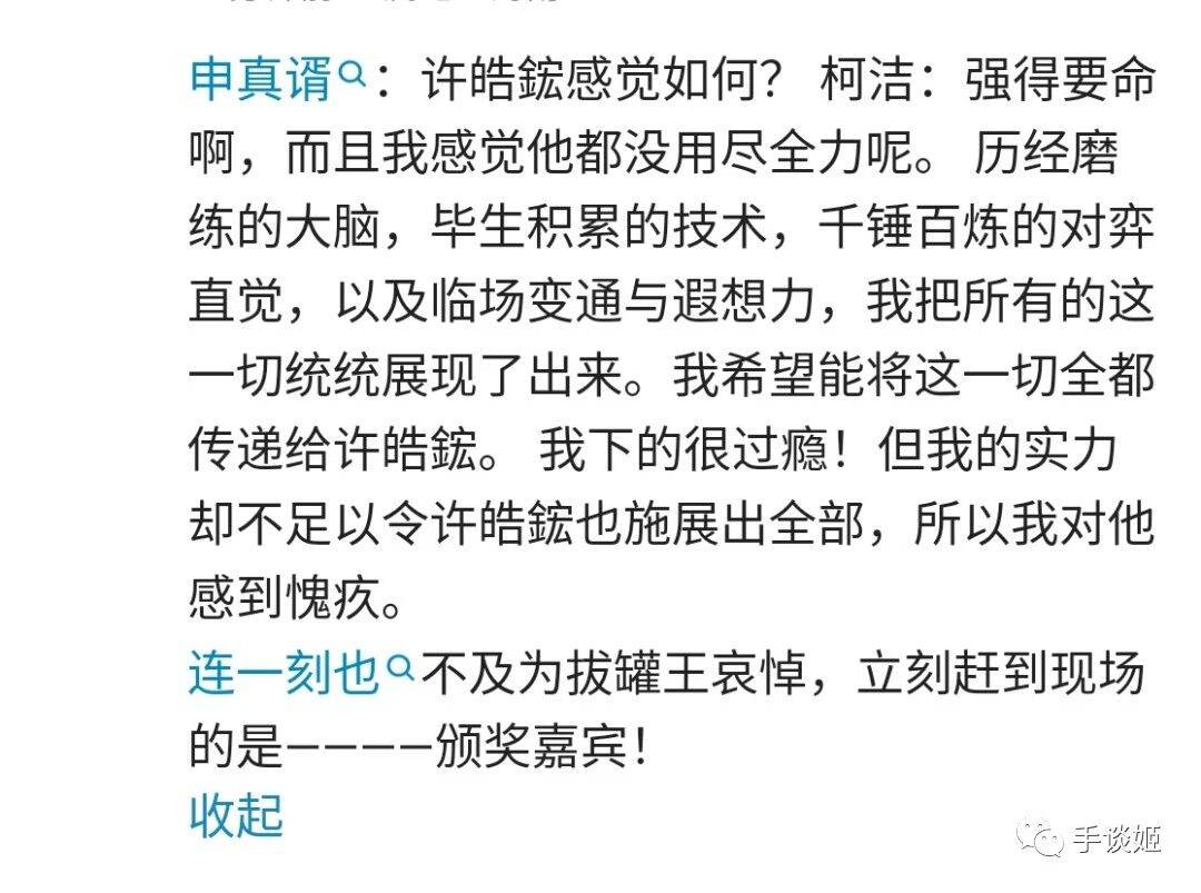 这下网友们又开始说了,当代最强咒术师遭腰斩,当代八冠王棋手被挑战者击败……原来,柯洁才是五条悟啊!
