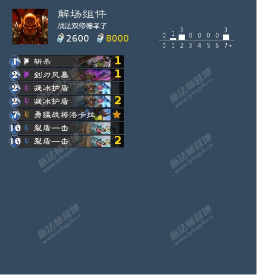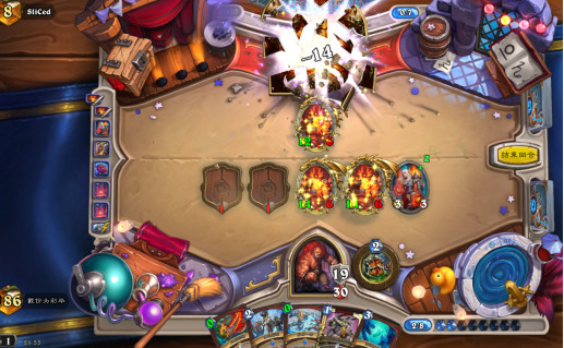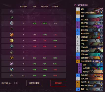 可以发现,对比防战来说我们的解场组件是很少的,除了经典的凝冰裂盾组合外就只有一张斩杀和剑刃风暴。我之所以只加入这几张解场牌一是因为卡位有限,最关键的在于对比以前的标准冲锋战,我们的斩杀回合要早很多,平均的胜局回合数在8回合以内,在过牌跟上的情况下这几张解牌已经足够支撑我们活到斩杀回合了。最关键的点在于这些都是低费解牌,在解场的同时不太影响我们的过牌节奏,而且能处理一些高威胁的随从,例如奇迹贼的大范、88巨人等。
