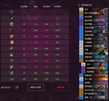 可以看到在200场对局的基数下,我们小劣德、萨、术这三个职业,其中爆牌德、偶数萨、任务术我们还是大优的,也就是靠这些对局稍微帮我们刷了一下对战这3个职业的胜率,实际上对局奇迹德、过载萨、弃牌术应该都是大劣(战吼萨小劣),为了针对奇迹德,我都在牛里藏了伏兵,也只能略微提高一点胜率而已。