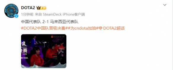 今天(10月1日)上午,杭州亚运会电竞项目《Dota2》的半决赛中,中国代表队对阵马来西亚代表队,中国队最终以2:1的比分击败马来西亚队晋级决赛!