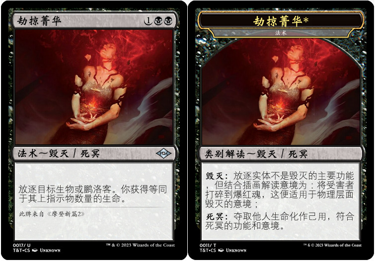 这类类别通常体现出魔咒的牌张效果,一定程度上受整体意境影响。举例来说,毁灭和祛离类别都涉及到放逐,毁灭类别关注物理上伤害或破坏有实体的物体,祛离类别关注以非毁伤性手段赶走实体与非实体以及消灭非实体,比如劫掠菁华和喂食盘蛇都会被赋予毁灭类别,从整体意境上来说,它们都是从物理层面摧毁物理实体,一个被榨成了红魂一个被胃酸消化。化金既不是毁灭也不是祛离,而是变化类别,生物被变成了黄金,既不是被毁灭也不是被驱逐。