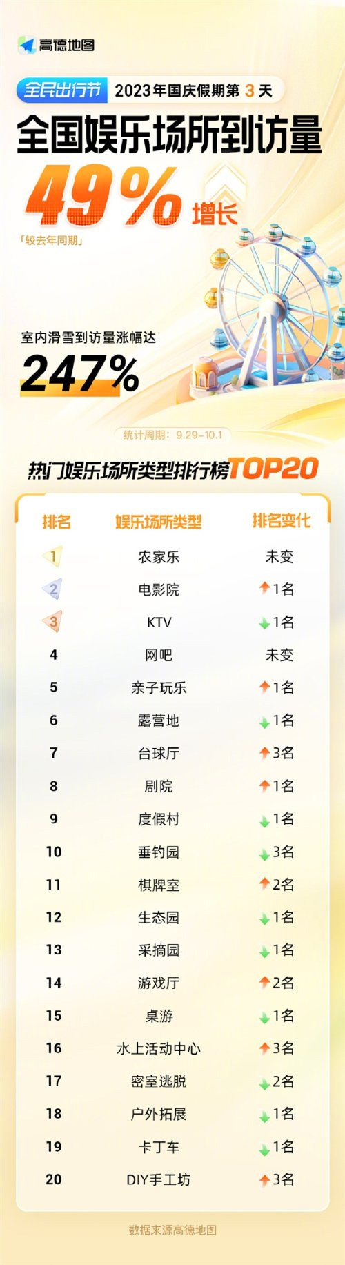 据高德《十一出行报告》显示,国庆假期最受欢迎的娱乐场所类型TOP3为:农家乐、电影院和KTV。