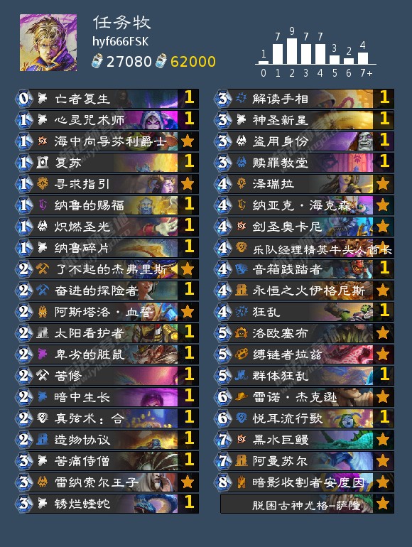 对局思路:除非迫不得已,不要试图用任务终结对手!!!!!!做任务耗时长,投入费用多,收益不稳定,风险还高。这套卡组终端有三,传统的58,伊格尼斯的十费武器,以及净化的碎片,前两者终结都比碎片来得更容易。任务的核心作用是提供检索而不是终结对局,第一阶段是比较重要的,可以帮你收回成本,二三阶段随缘做就好,节奏第一!但是同时,任务也是你需要考虑的内容,不着急做不代表不做。另外说一下伊格尼斯,伊格尼斯一般有三种用法,第一找一费武器,下毒或者狂战来打节奏,第二找五费武器中期混,这种情况是最少的,但是五费武器仍然是给力的,第三是找十费武器终结对局,一般有条件找10费武器就不要找5费,而且风怒刀可以配合姐夫找心中的恶魔,提供空场26点的斩杀线。