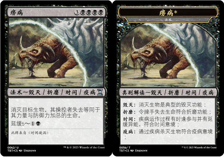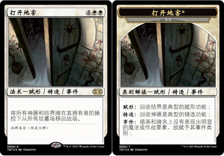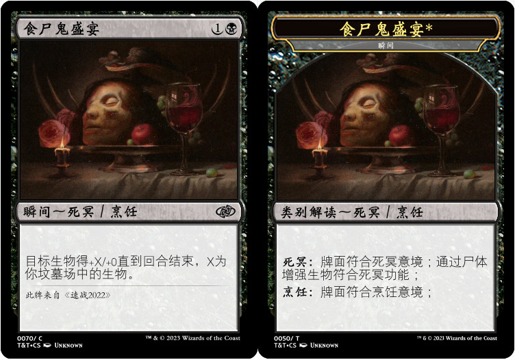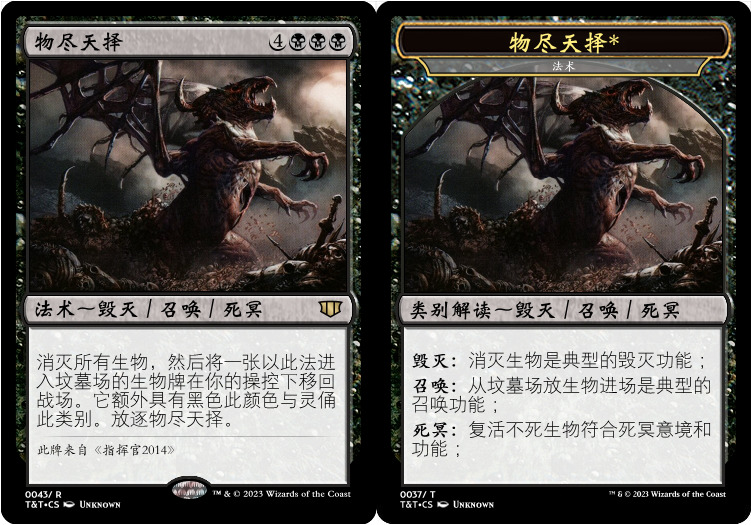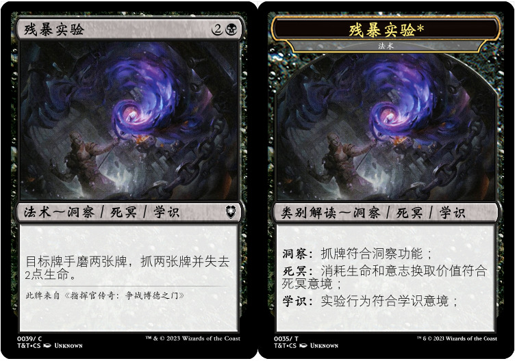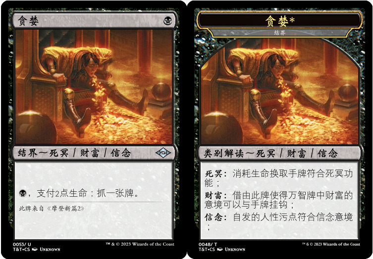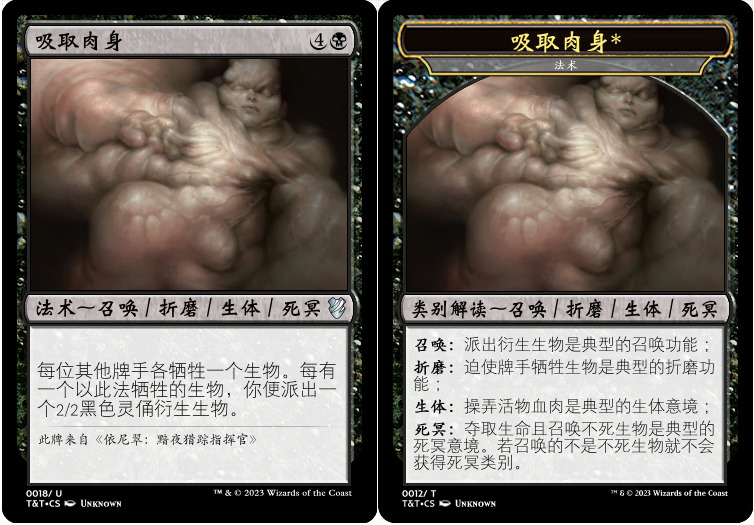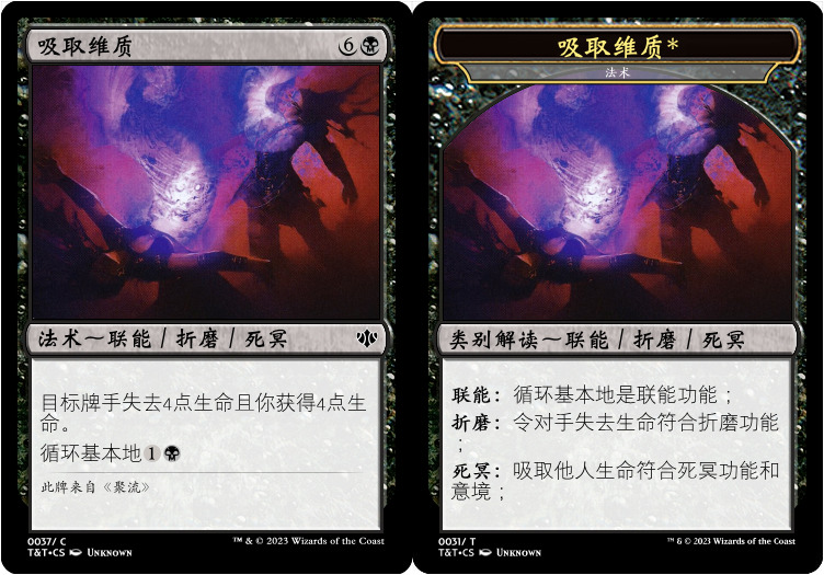这类类别会根据整体意境和牌张效果来确定它在某张牌上所属的类别分类。以死冥为例,在意境方面它既属于抽象的死)(亡概念,又包含死灵术这种魔法派系,在亡者华尔兹中死冥类别就包含更多死灵术的意境;在功能方面,死冥类别涵盖了涉及夺取生命力、用生命力换取价值、与坟场互动、与不死生物互动相关的效果,吸取维质体现了夺取生命力的功能(通常获得生命力,会具有活力类别,但死冥类别具有相似的效果,故在赋予类别时吸取维质会具有死冥/折磨),村民仪式则体现死冥类别中用生命力换取价值的功能。