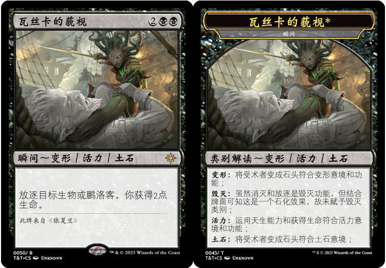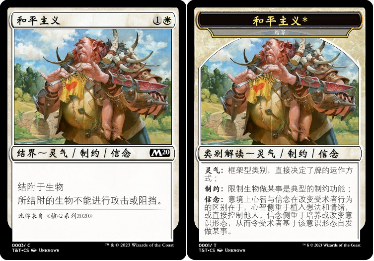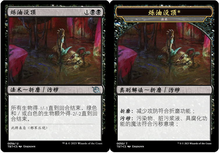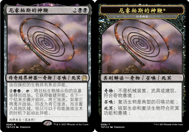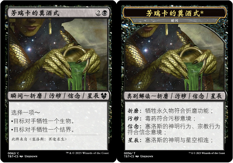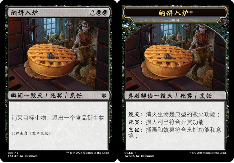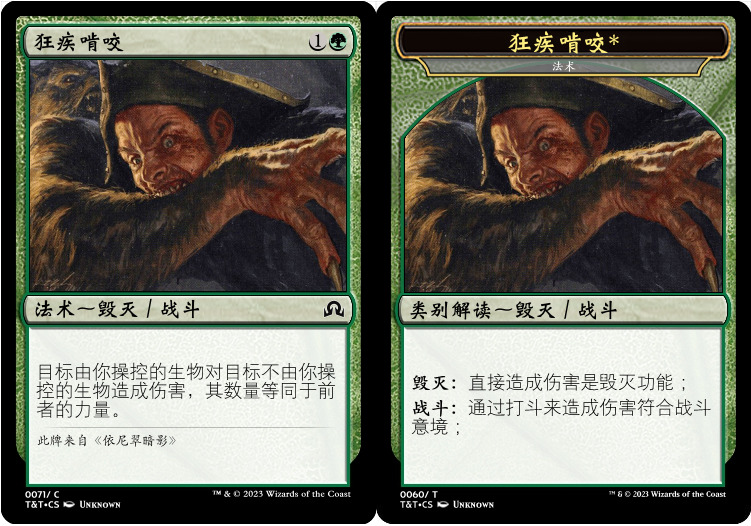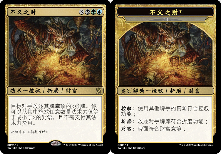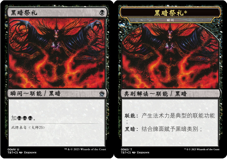 这类类别会根据整体意境和牌张效果来确定它在某张牌上所属的类别分类。以死冥为例,在意境方面它既属于抽象的死)(亡概念,又包含死灵术这种魔法派系,在亡者华尔兹中死冥类别就包含更多死灵术的意境;在功能方面,死冥类别涵盖了涉及夺取生命力、用生命力换取价值、与坟场互动、与不死生物互动相关的效果,吸取维质体现了夺取生命力的功能(通常获得生命力,会具有活力类别,但死冥类别具有相似的效果,故在赋予类别时吸取维质会具有死冥/折磨),村民仪式则体现死冥类别中用生命力换取价值的功能。