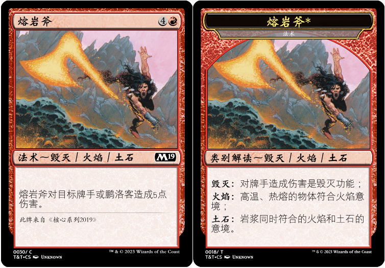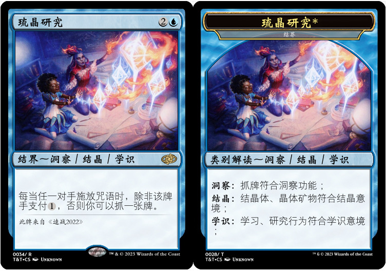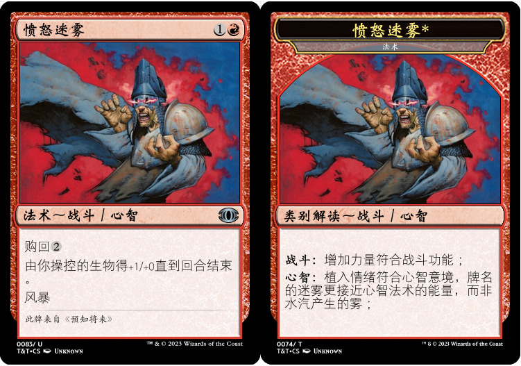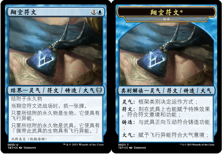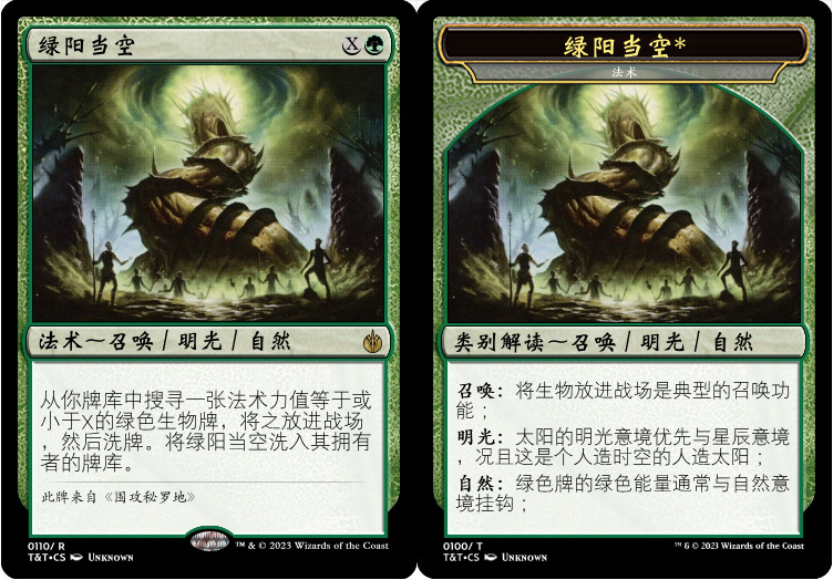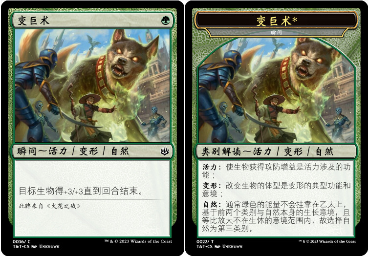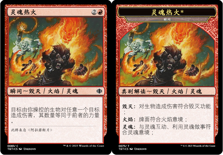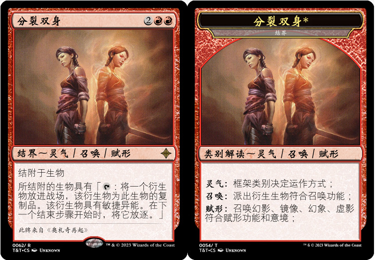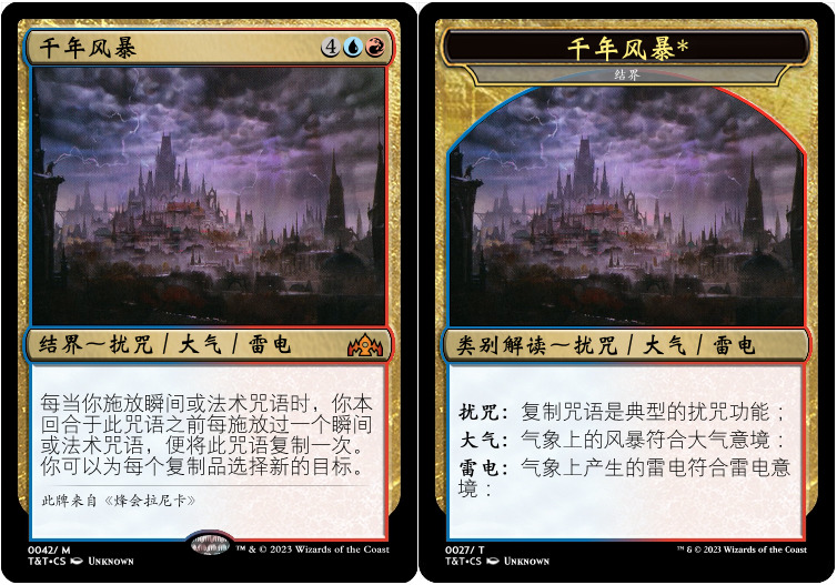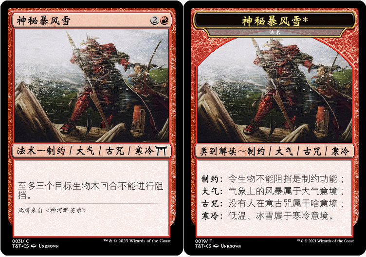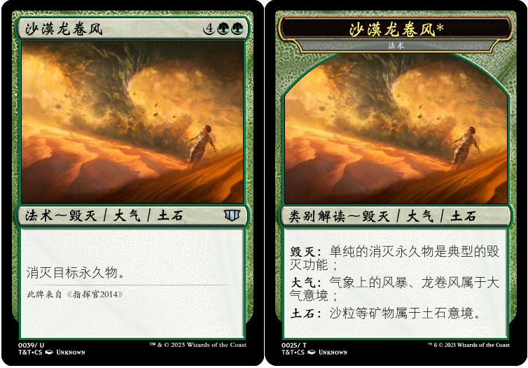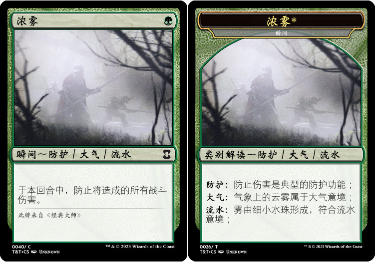 这类类别通常只会反应出魔咒的元素类别,几乎不会直接影响卡牌的效果。举例来说,不管是火焰、流水还是明光,它们都是意境型类别,并不会决定它们产生什么效果,尽管火焰牌、流水牌或明光牌都有横置生物或令其不能进行阻挡的魔咒,但这些效应多出现在制约这个功能主导类别中。由于意境型类别几乎不决定牌张效果,我们可以相对轻松的为意境型加入新的家庭成员·····