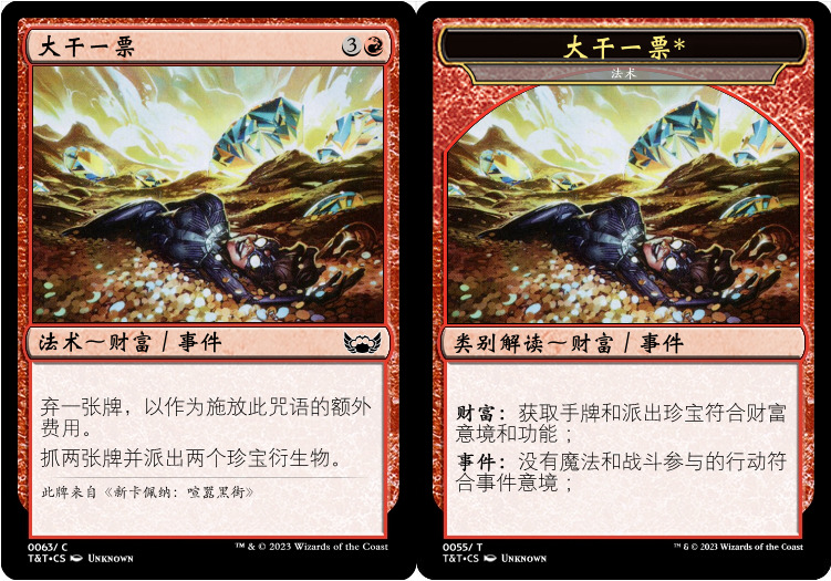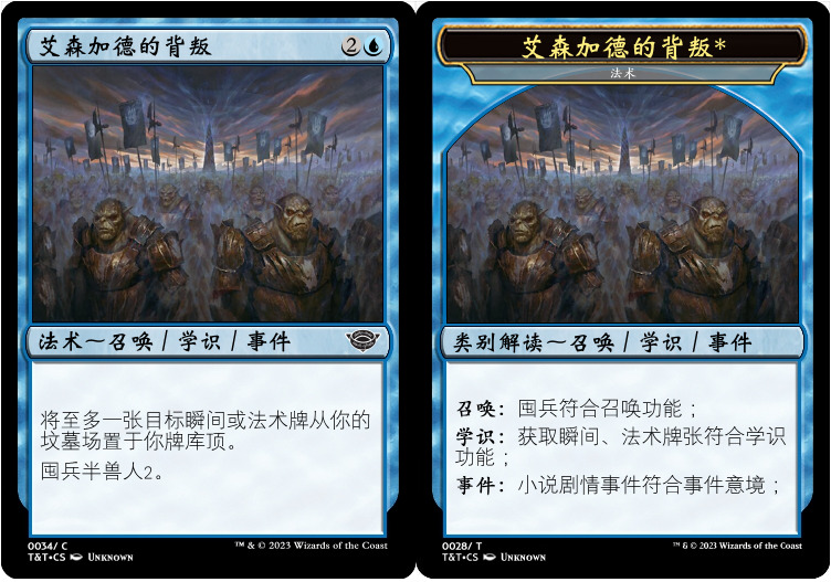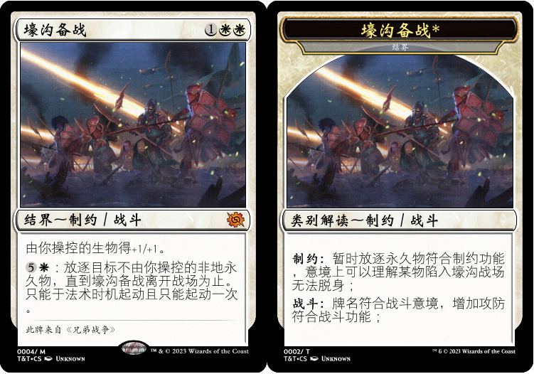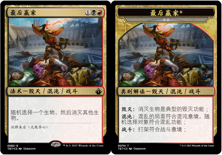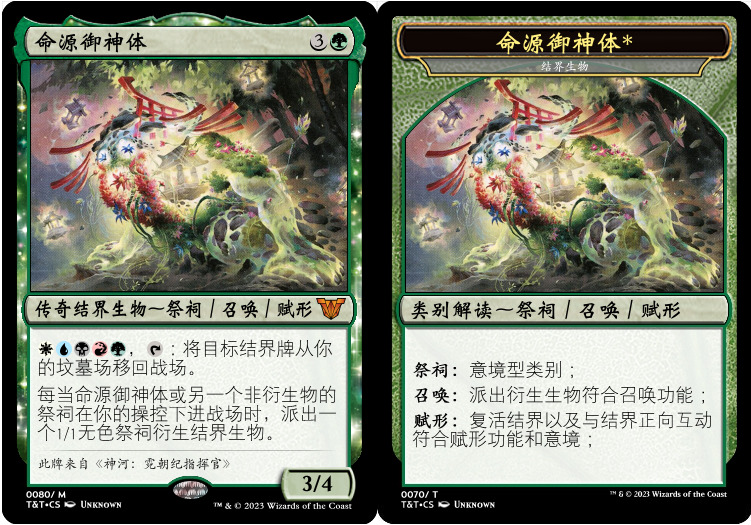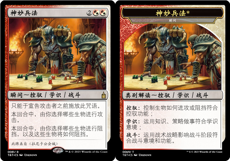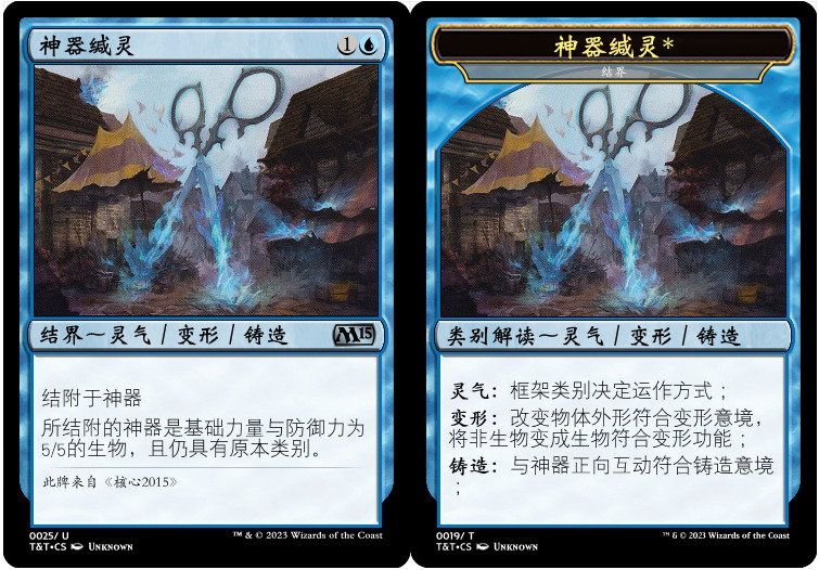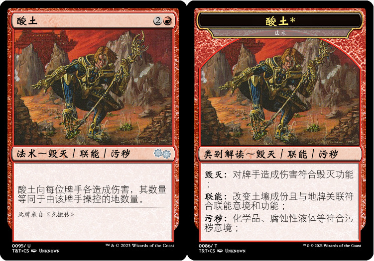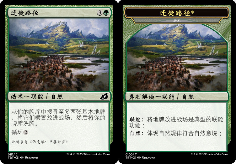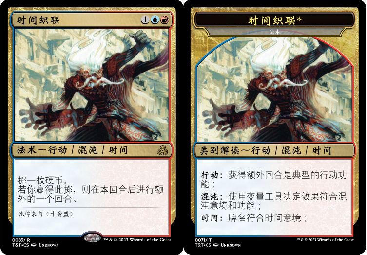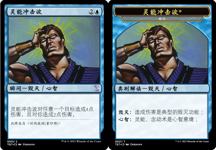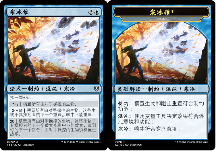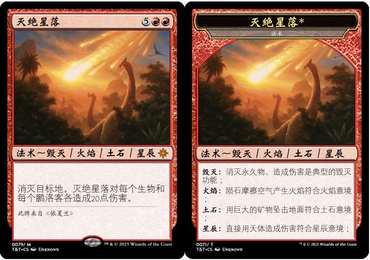 这类类别通常只会反应出魔咒的元素类别,几乎不会直接影响卡牌的效果。举例来说,不管是火焰、流水还是明光,它们都是意境型类别,并不会决定它们产生什么效果,尽管火焰牌、流水牌或明光牌都有横置生物或令其不能进行阻挡的魔咒,但这些效应多出现在制约这个功能主导类别中。由于意境型类别几乎不决定牌张效果,我们可以相对轻松的为意境型加入新的家庭成员·····