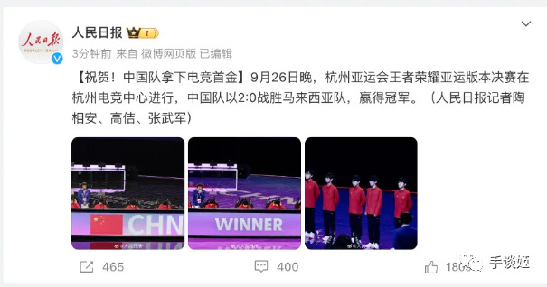 在得知夺得电竞首金的时候,姬第一反应就是看看****和***怎么说,看到这些平时总是严肃报道正经新闻的主流媒体纷纷对亚运电竞首金送上祝福时,姬的内心也非常激动,同时又感到非常梦幻,有一种终于被认可的满足感,那一刻,姬觉得自己作为一路和电竞走过来的参与者、见证人,与有荣焉。