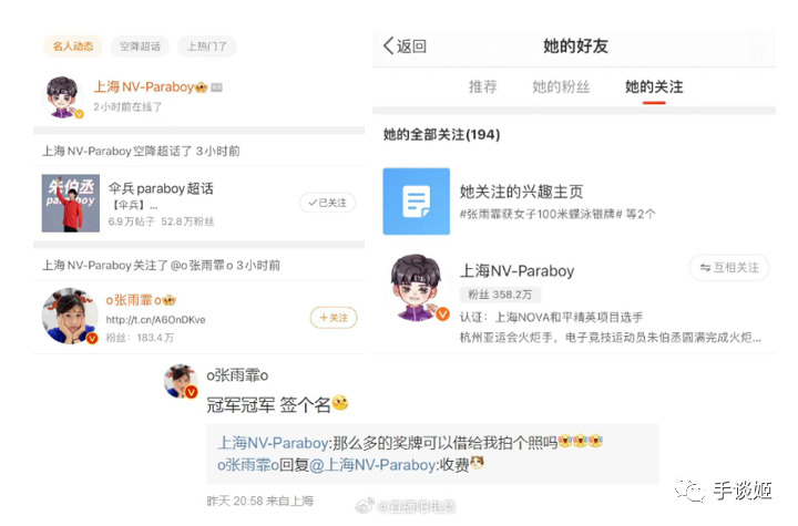 朱伯丞选手则和游泳项目“进货王”张雨霏在微博互关,看着自己喜欢的电竞选手跟知名运动员这么熟稔的样子,感觉还真有点奇妙。可惜了,张雨霏不肯借奖牌给我们拍照!