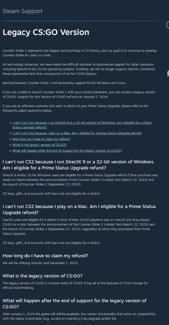 《CS2》未来将仅支持 64 位 Windows 和 Linux 系统。无法游玩的玩家则可以访问一个旧版本的《CS:GO》,该版本的支持将持续至 2024 年 1 月 1 日。而最近于 2023 年 3 月 22 日至 9 月 27 日期间购买了 Prime 会员的无法访问玩家则可以申请退款,申请日期截至 2023 年 12 月 1 日。被封禁的账户没有资格申请退款。