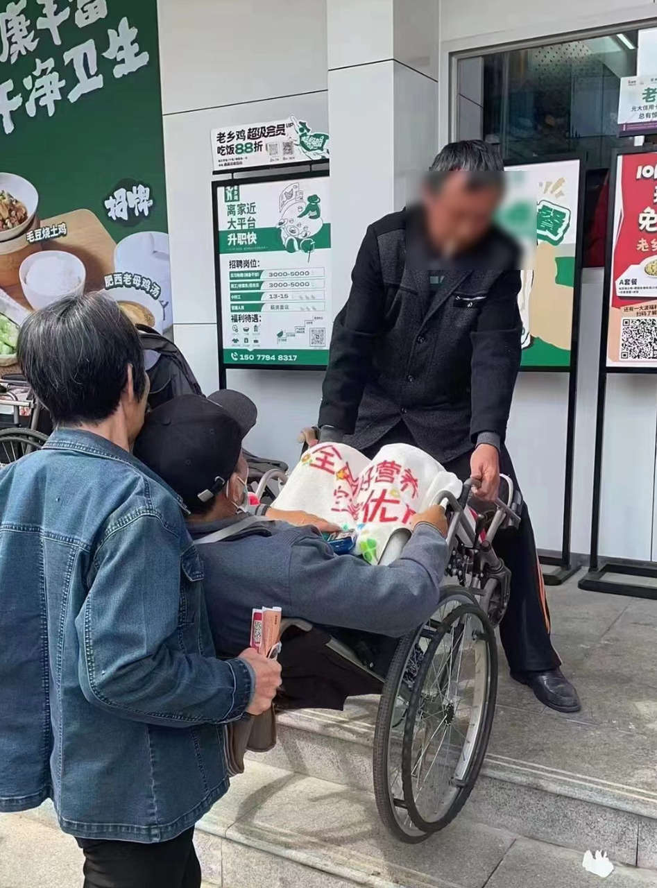 甚至还有个硬核的大爷,推着轮椅就过来吃饭来了。