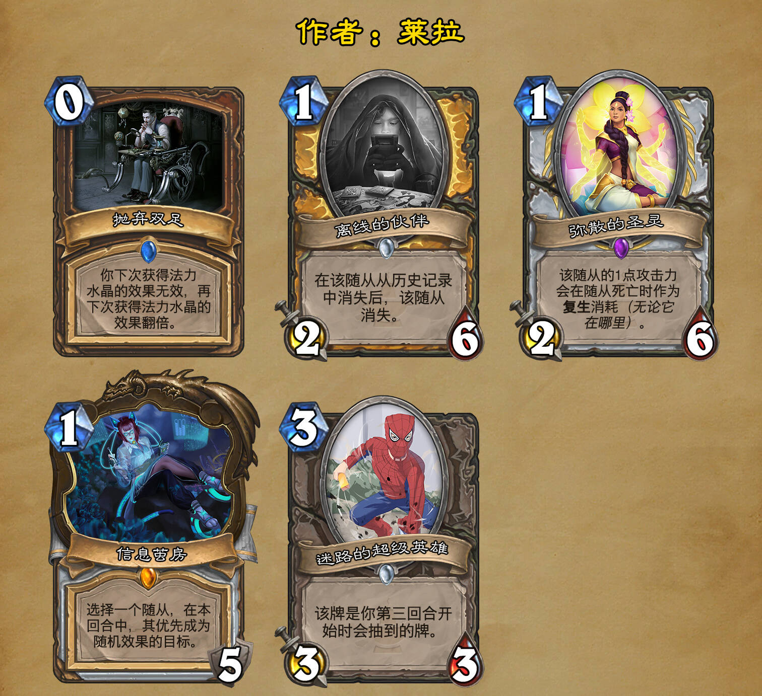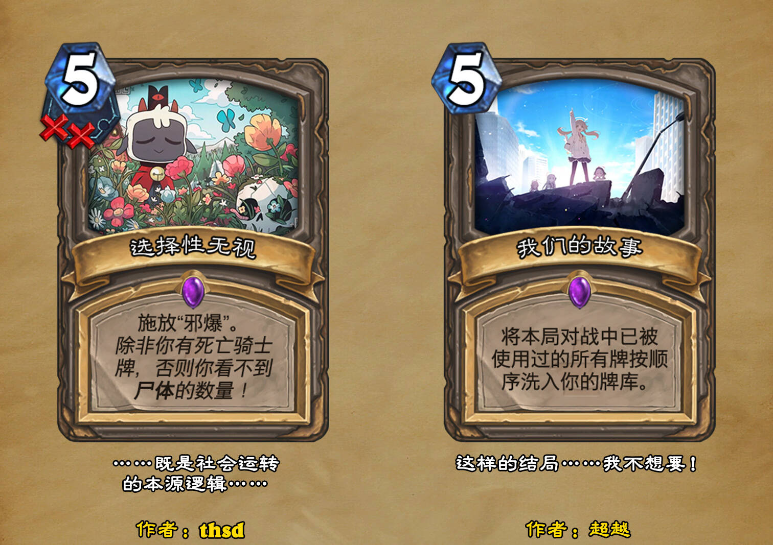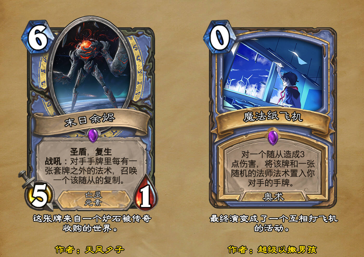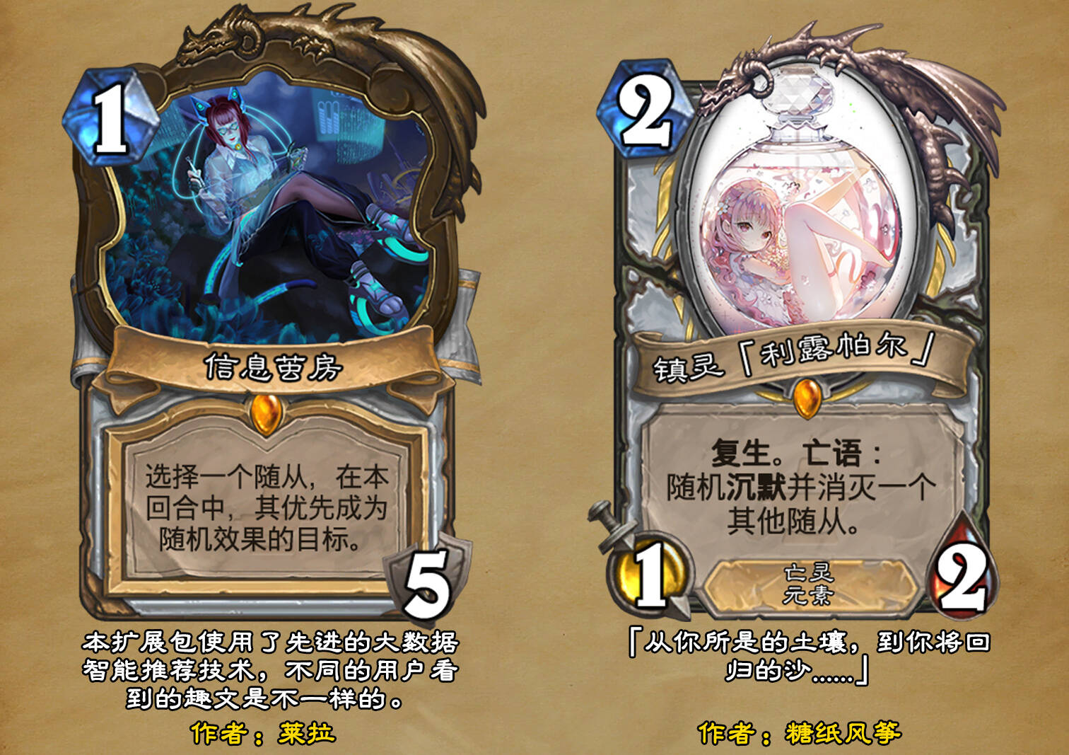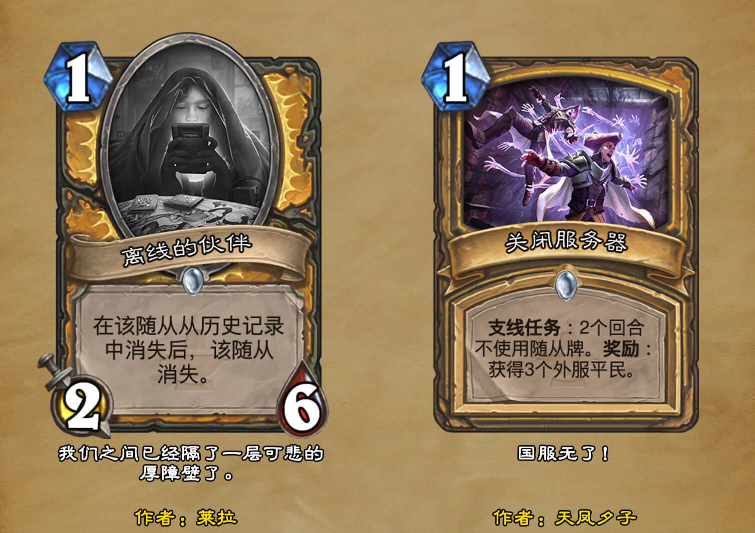 *本扩展包的设计工作于2023/01/22开始,碍于炉石国服关服,参与者的设计热情已大不如前,许多空格由他人完成;收集原画,制图,趣文则同样花费了一些时间,因此本扩展包拖延至2023/10/14才正式完工。全部的原画收集和制图工作及大部分趣文由thsd完成。