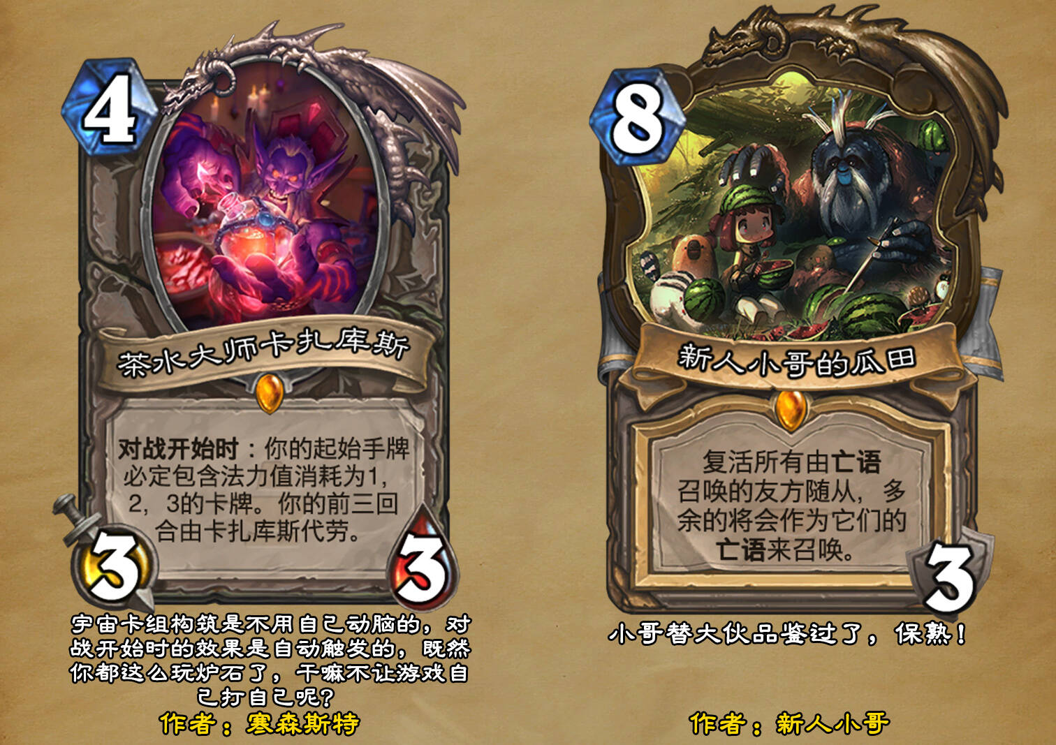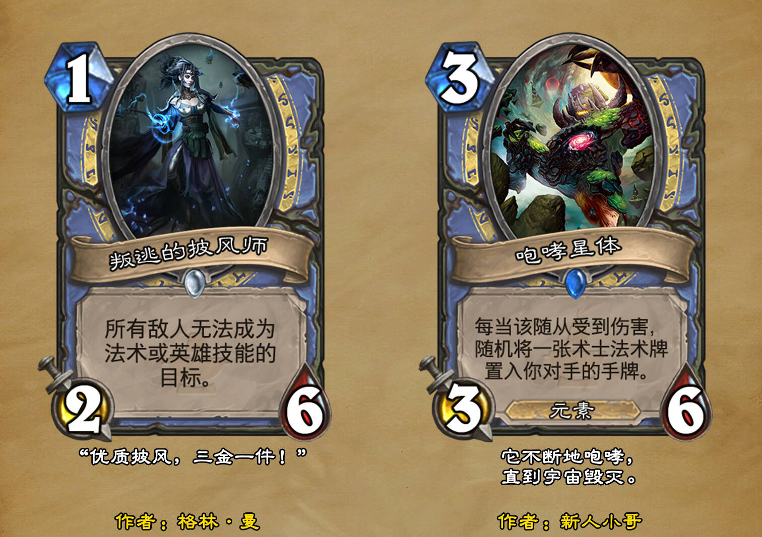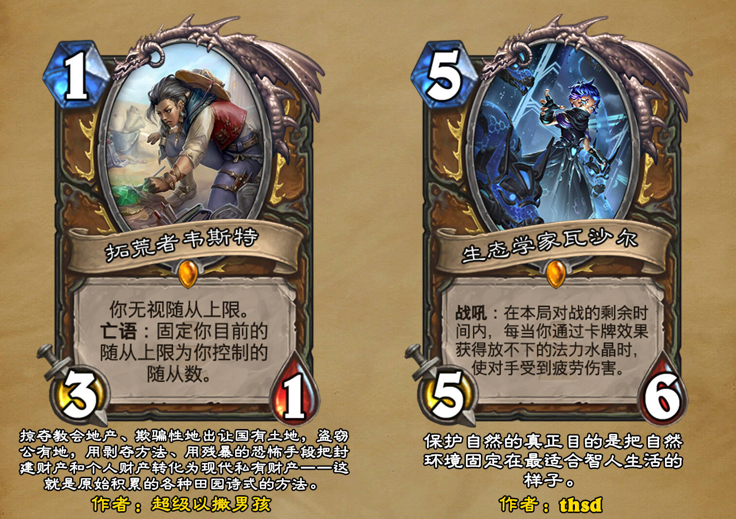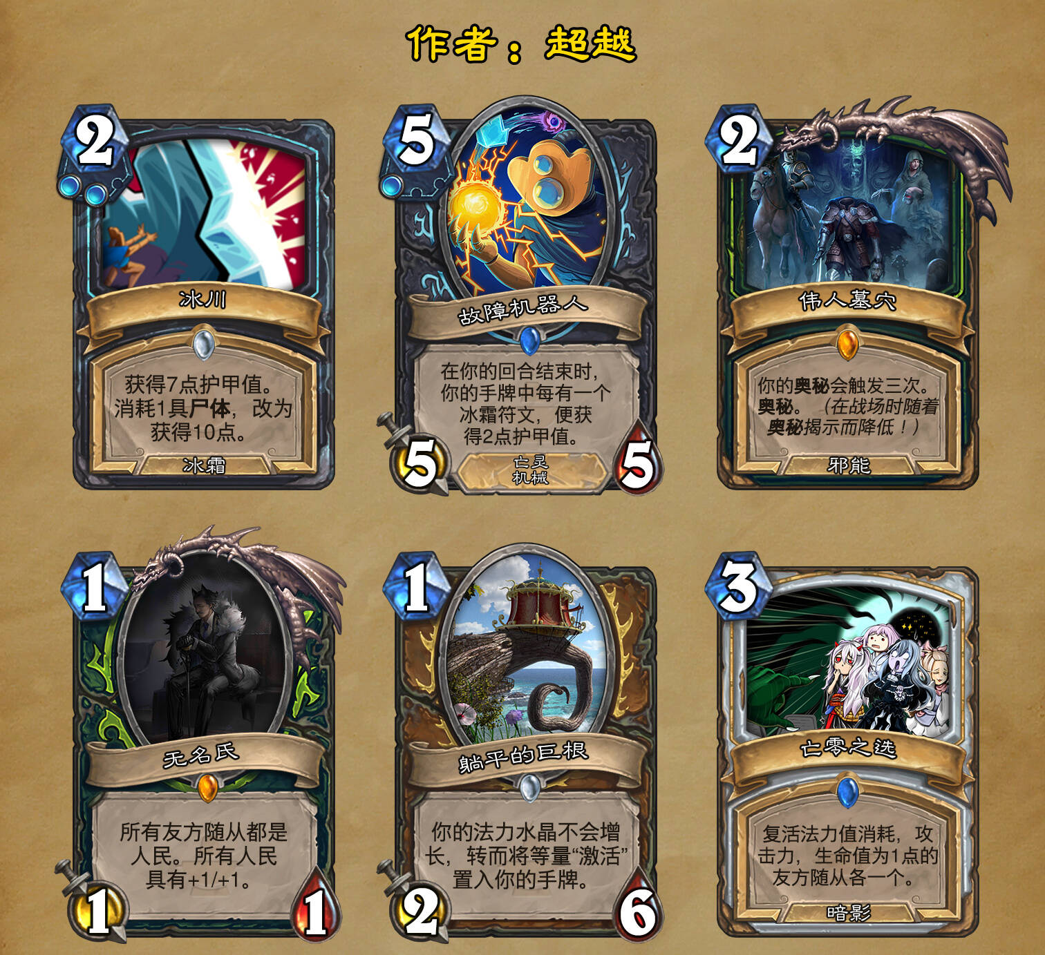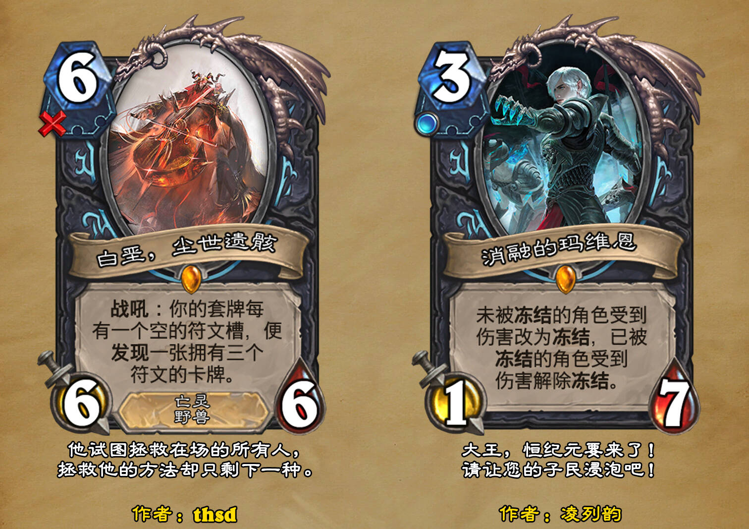*本扩展包的设计工作于2023/01/22开始,碍于炉石国服关服,参与者的设计热情已大不如前,许多空格由他人完成;收集原画,制图,趣文则同样花费了一些时间,因此本扩展包拖延至2023/10/14才正式完工。全部的原画收集和制图工作及大部分趣文由thsd完成。