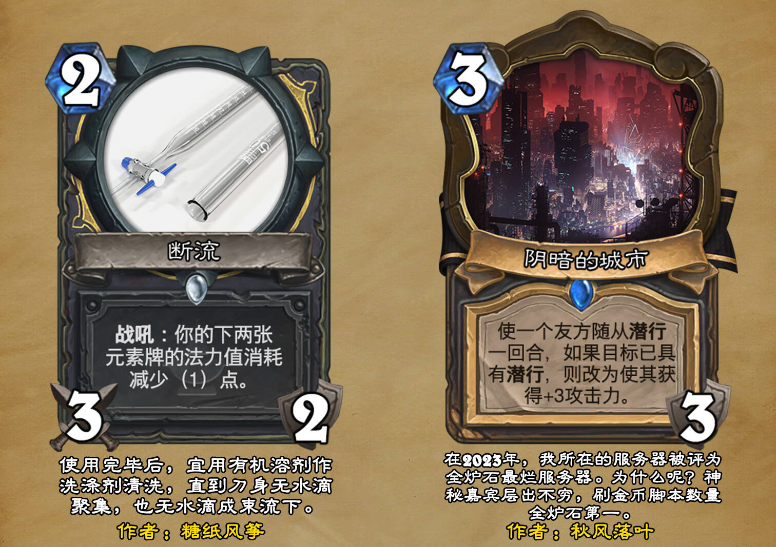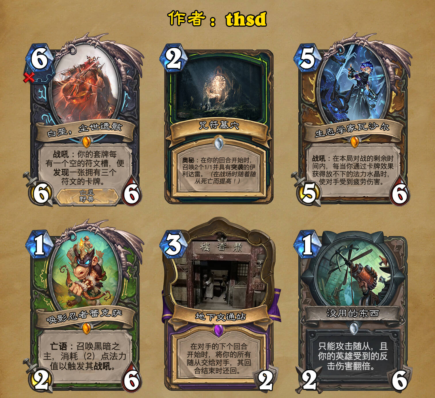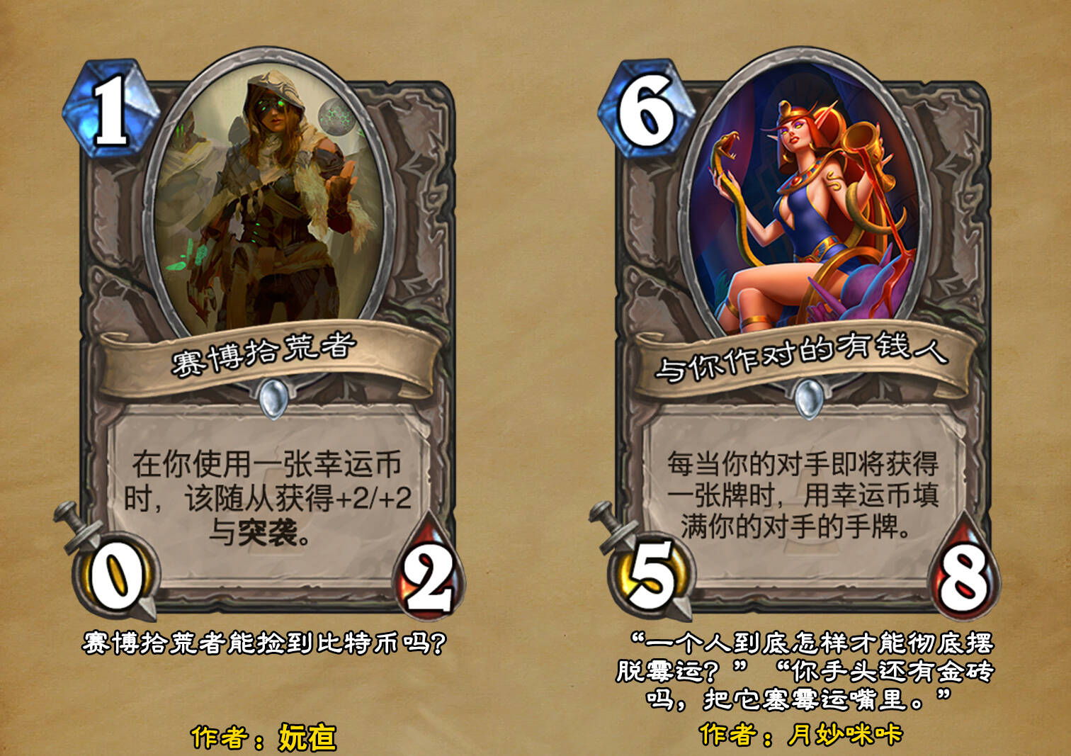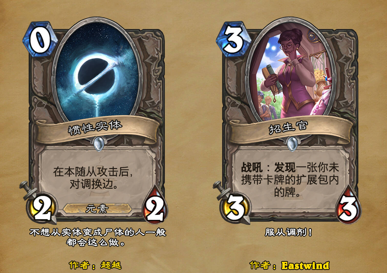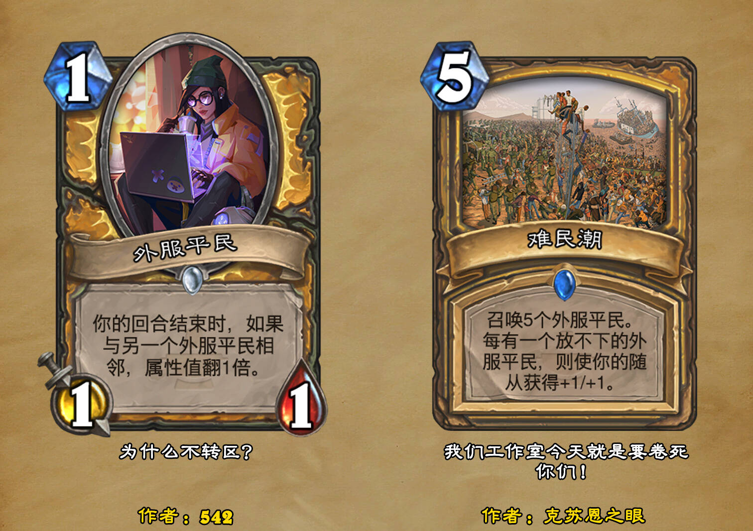 *本扩展包的设计工作于2023/01/22开始,碍于炉石国服关服,参与者的设计热情已大不如前,许多空格由他人完成;收集原画,制图,趣文则同样花费了一些时间,因此本扩展包拖延至2023/10/14才正式完工。全部的原画收集和制图工作及大部分趣文由thsd完成。