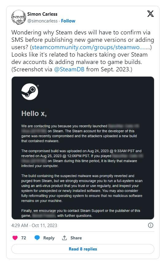GameDiscoverCo 新闻通讯的 Simon Carless 透露了新安全措施的消息。Carless 发布了一张来自 Valve 的信息截图,该信息称 Valve 已提醒那些账户被黑客入侵的开发者。