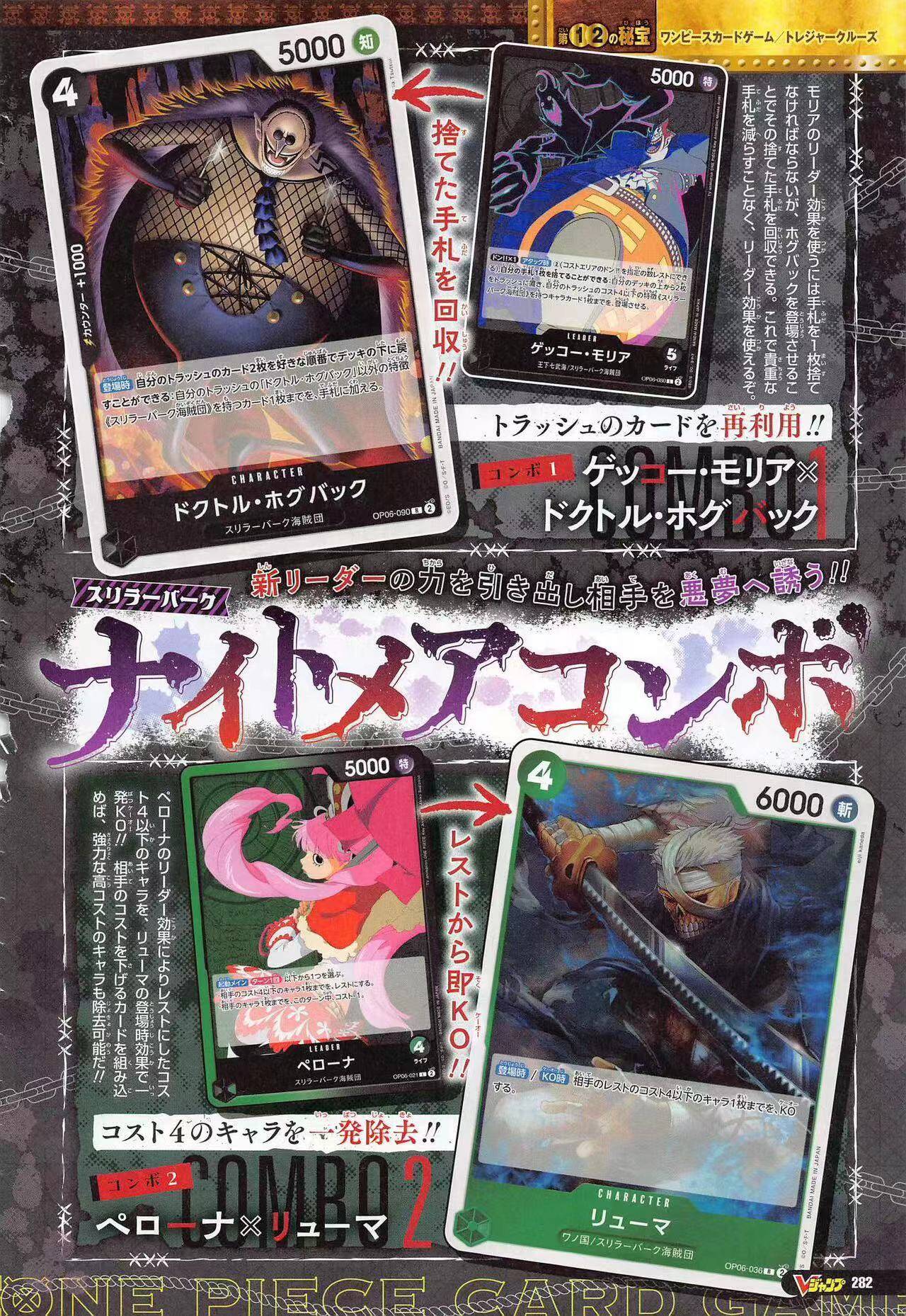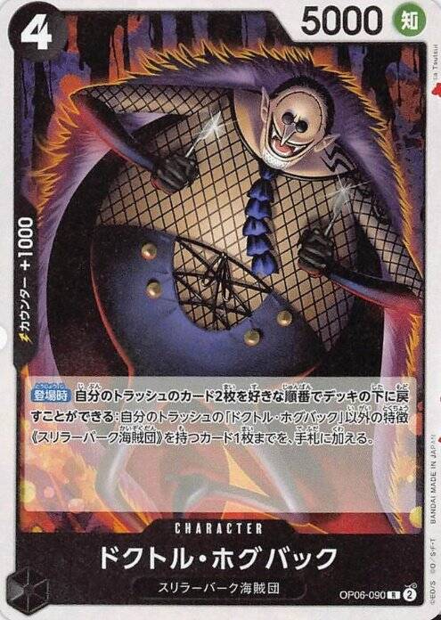 咚x1/攻击时:②:丢弃一张手牌:从牌库顶弃置两张牌、从己方弃牌区登场一张费用为4或以下,且具有[恐怖三桅帆船海贼团]特征的角色。