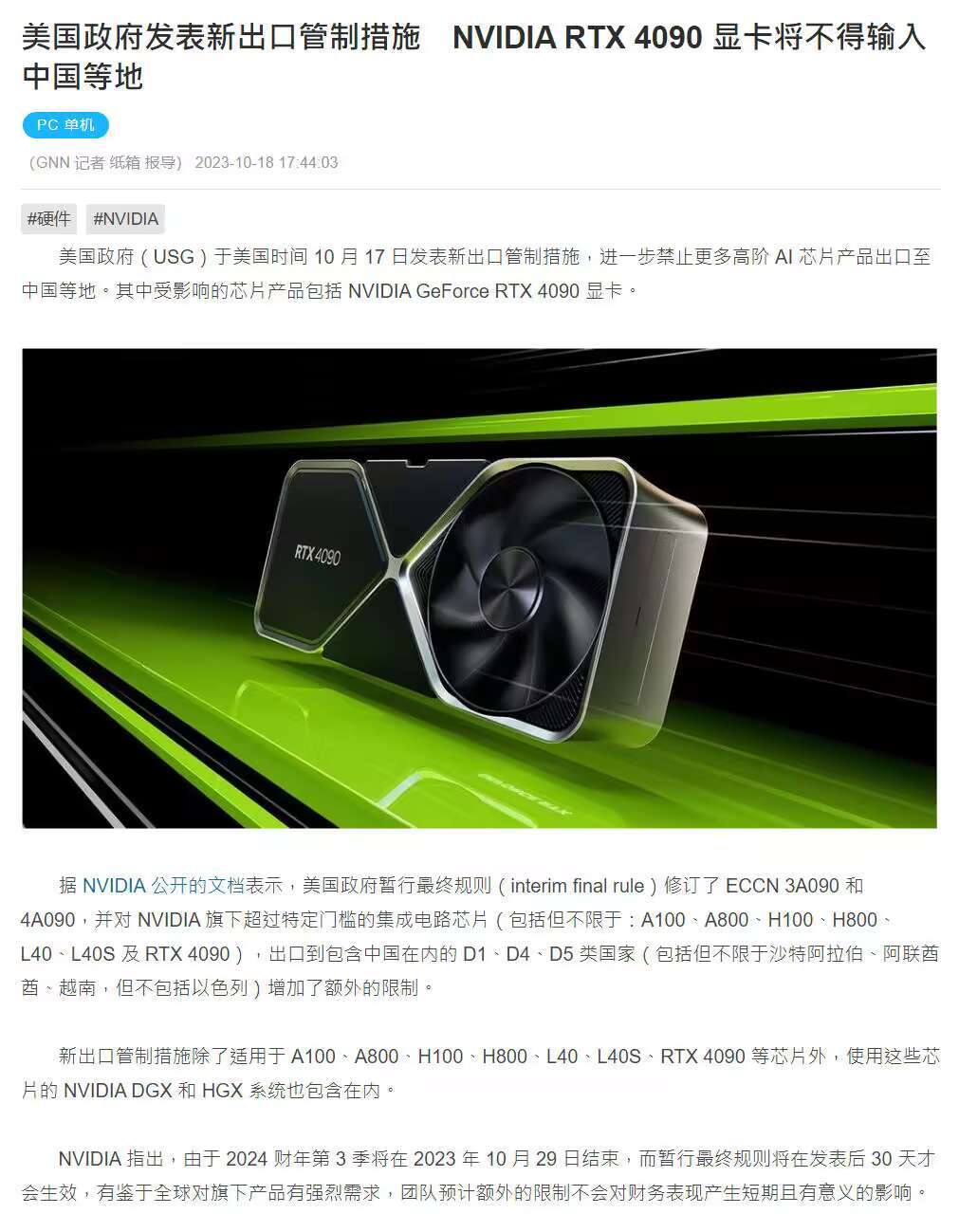10月18日消息,昨夜晚间,美政府更新出口管制规定,发起了对于中国显卡的新一轮制裁。