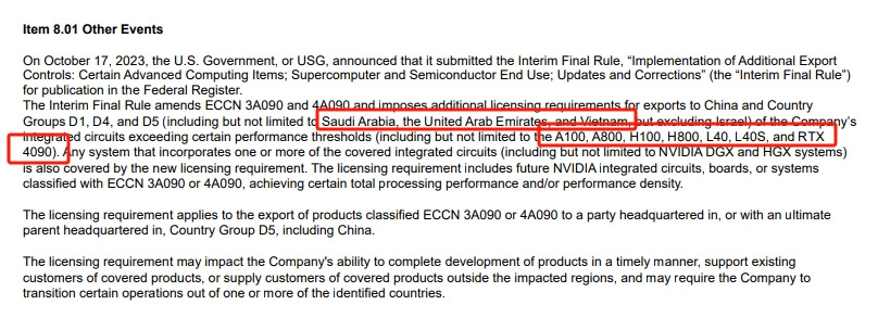 在美国政府公布扩大对高性能AI芯片的出口管制措施后,英伟达也向美国证券交易委员会(SEC)提交文件做出详细说明。