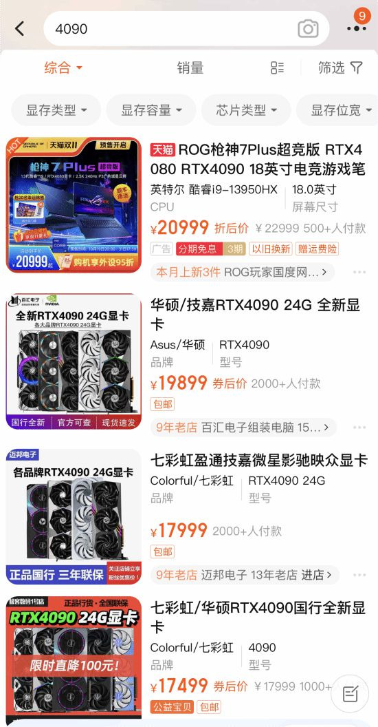 第三方平台方面,RTX 4090则迎来全面涨价或显示无货,目前淘宝平台价格已在1.7万-3万元之间。