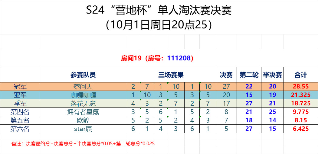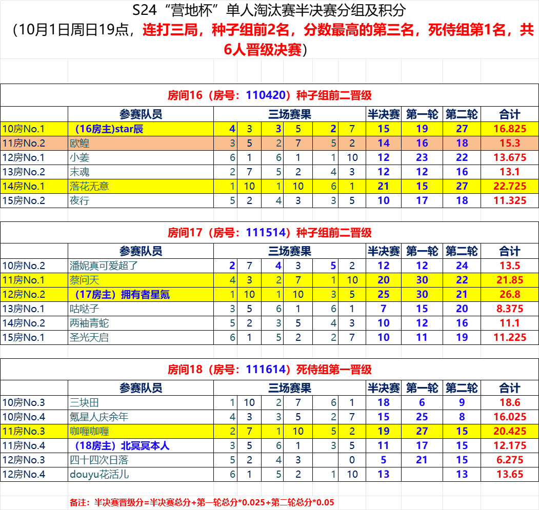 本次“营地杯”单人淘汰赛一共60名玩家参加报名,初赛两轮比赛过后一共18名玩家进入了半决赛: