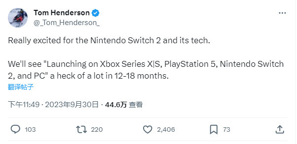 知名舅舅Tom Henderson在推文中表示他本人对Switch 2及其技术非常兴奋,未来12-18个月,玩家将会看到大量多平台游戏宣布时也会同步登陆Switch 2。