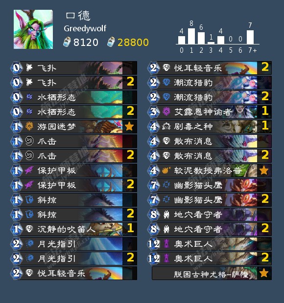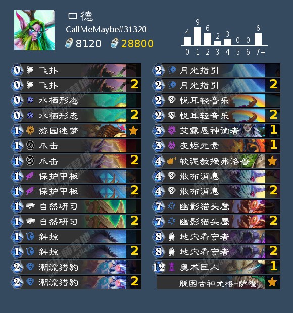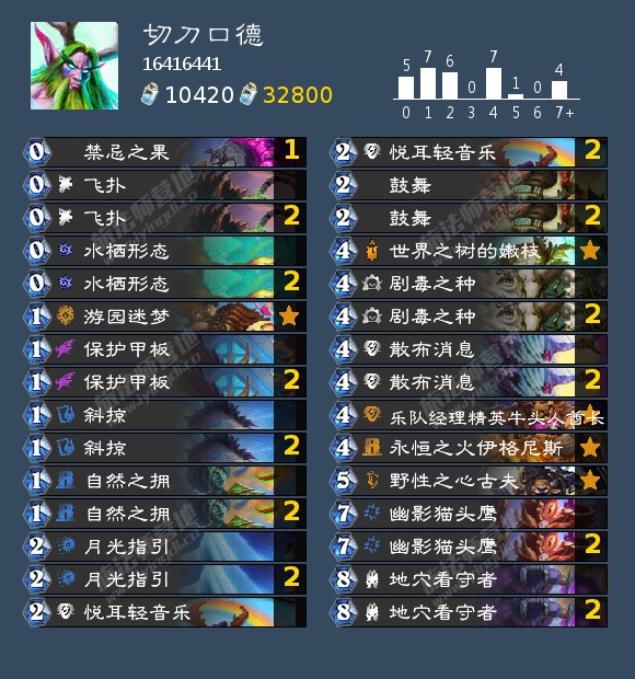 本质上是依靠造刀哥的OTK,有了嫩枝以后可将蓝分为两管,前一管用于造刀提嫩枝和打出口德组件,剩下的蓝用禁忌之果一次性全部提供为攻击力,上限很高下限就是口德的平均线左右。我个人水平有限昨日上传仅88名,今日没打掉为95,但仍感觉未发挥该卡组实力的五成。