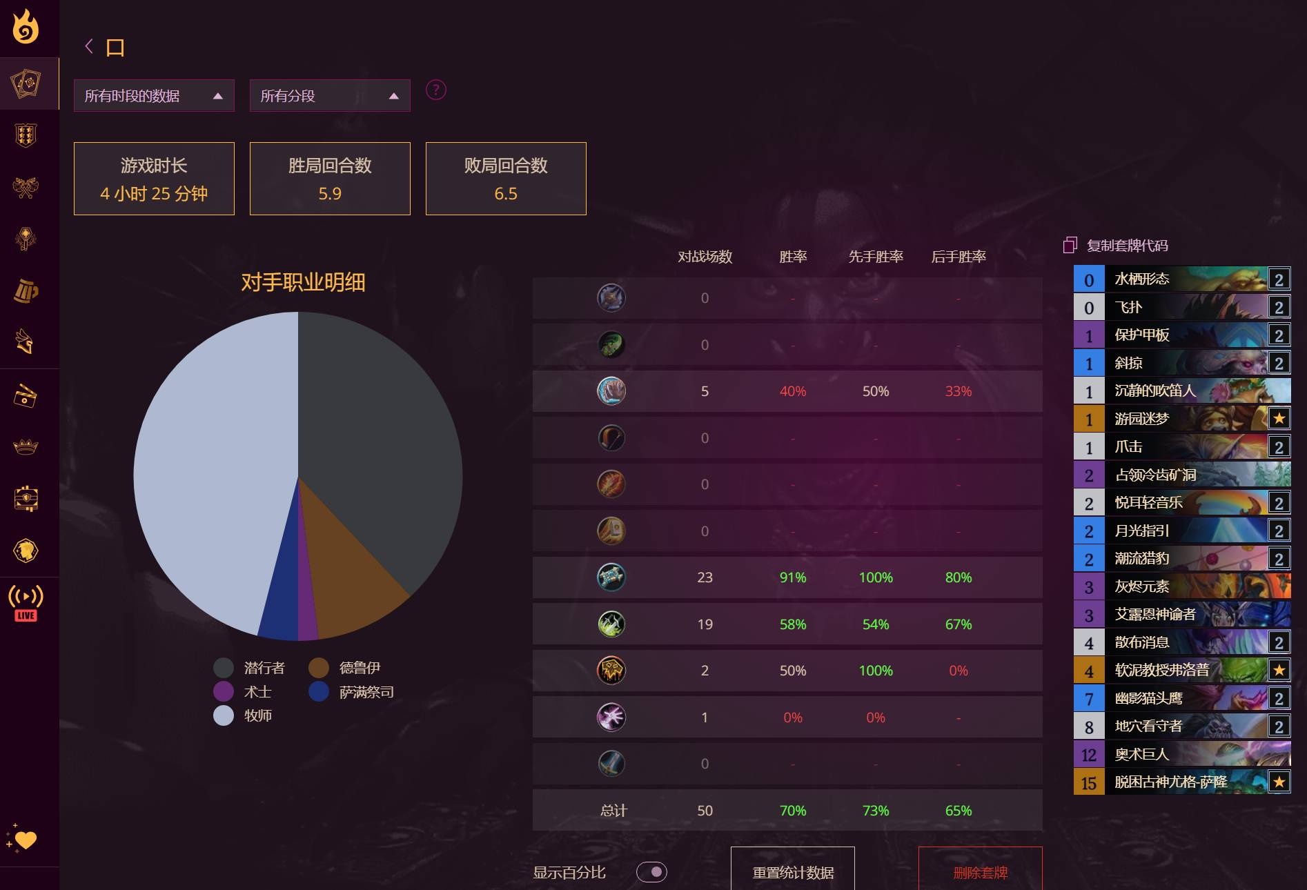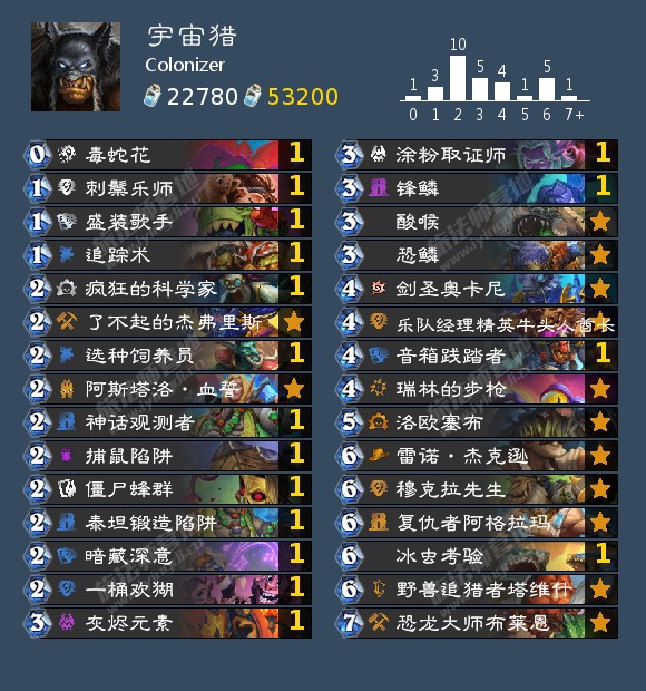 楼主全程使用宇宙猎从青铜10打到亚服前50。在熟练使用的基础下,卡组在当前环境下有一定的强度保障。