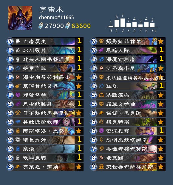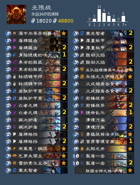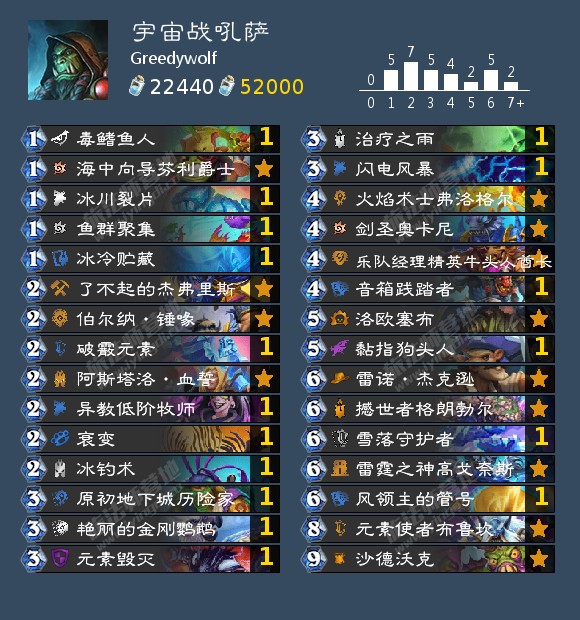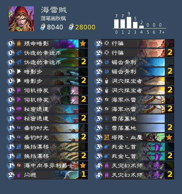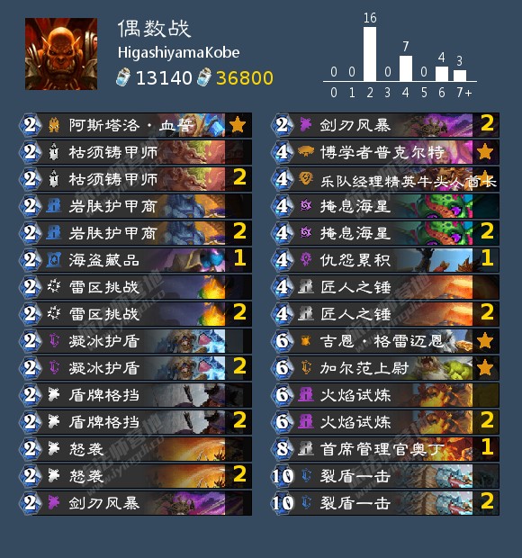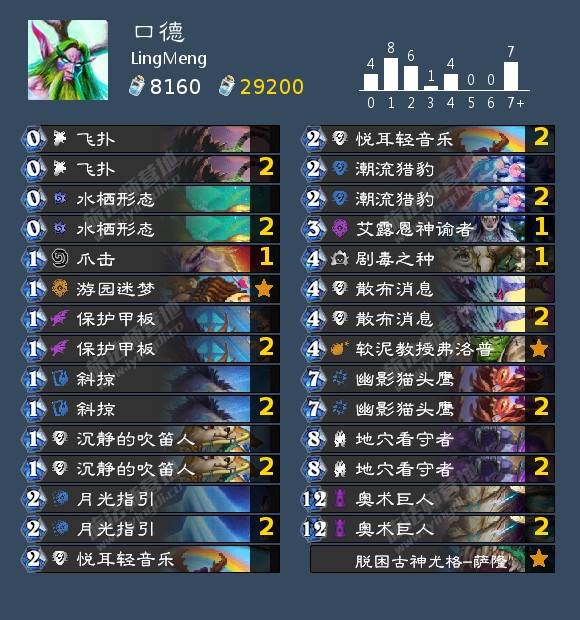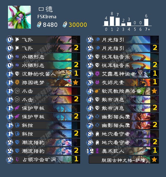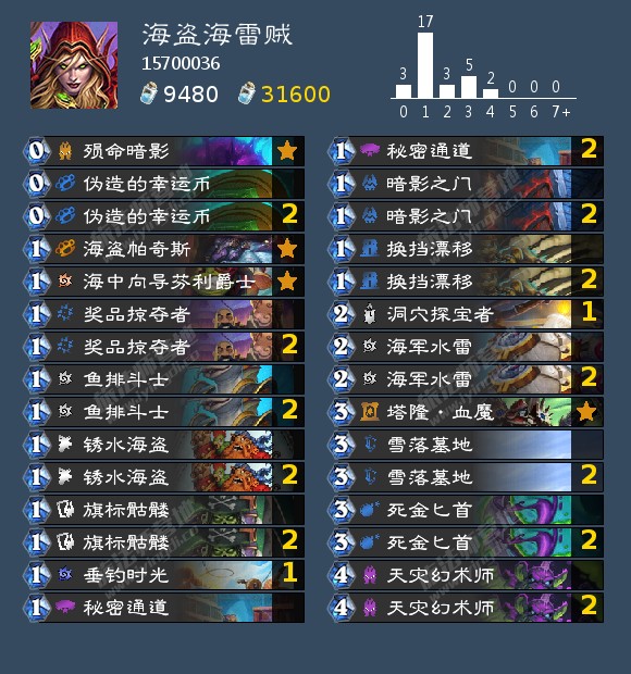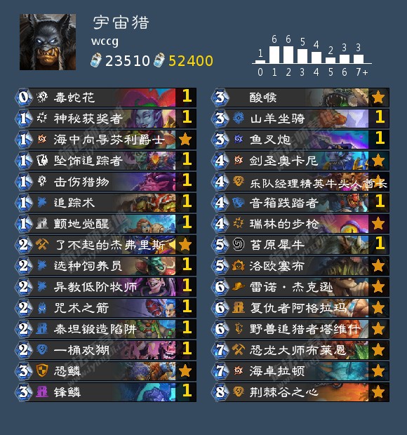 - 天梯卡组: 口德,宇宙猎,快攻暗牧,奇迹贼,海雷贼,海盗海雷贼,宇宙战吼萨,战吼萨,宇宙术,海防战,无限战,偶数战