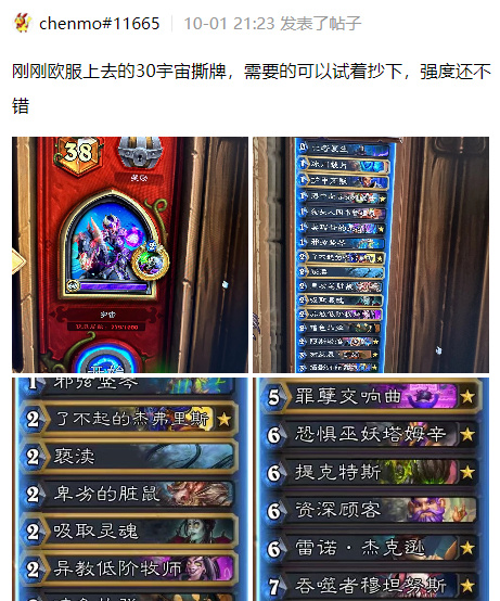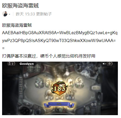以上以及往后的搬运完全不代表营地炉石卡组日报组所有成员的立场。营地炉石日报组仅仅想純搬运并提供一个汇集与整合卡组资讯的地方来让有兴趣的玩家参考。关于我们提供的卡组,如有任何疑问或想有更多研究,请访问来源链接或询问原卡组作者本人。在炉石社区规模日益缩减的当下,我们邀请大家能抱持着理性讨论的态度交流,一起创造一个更和谐、更包容、更友善的游戏社区。