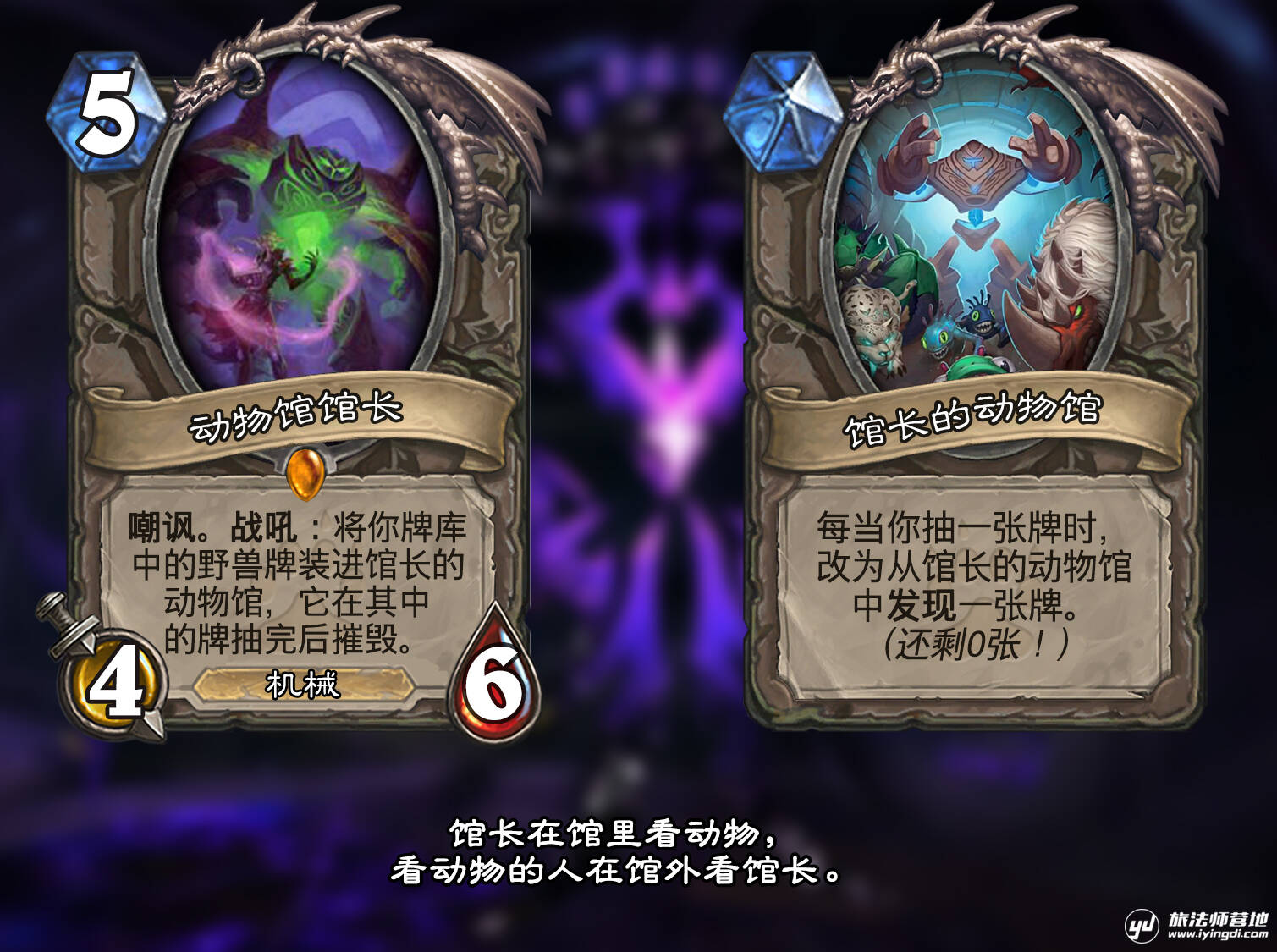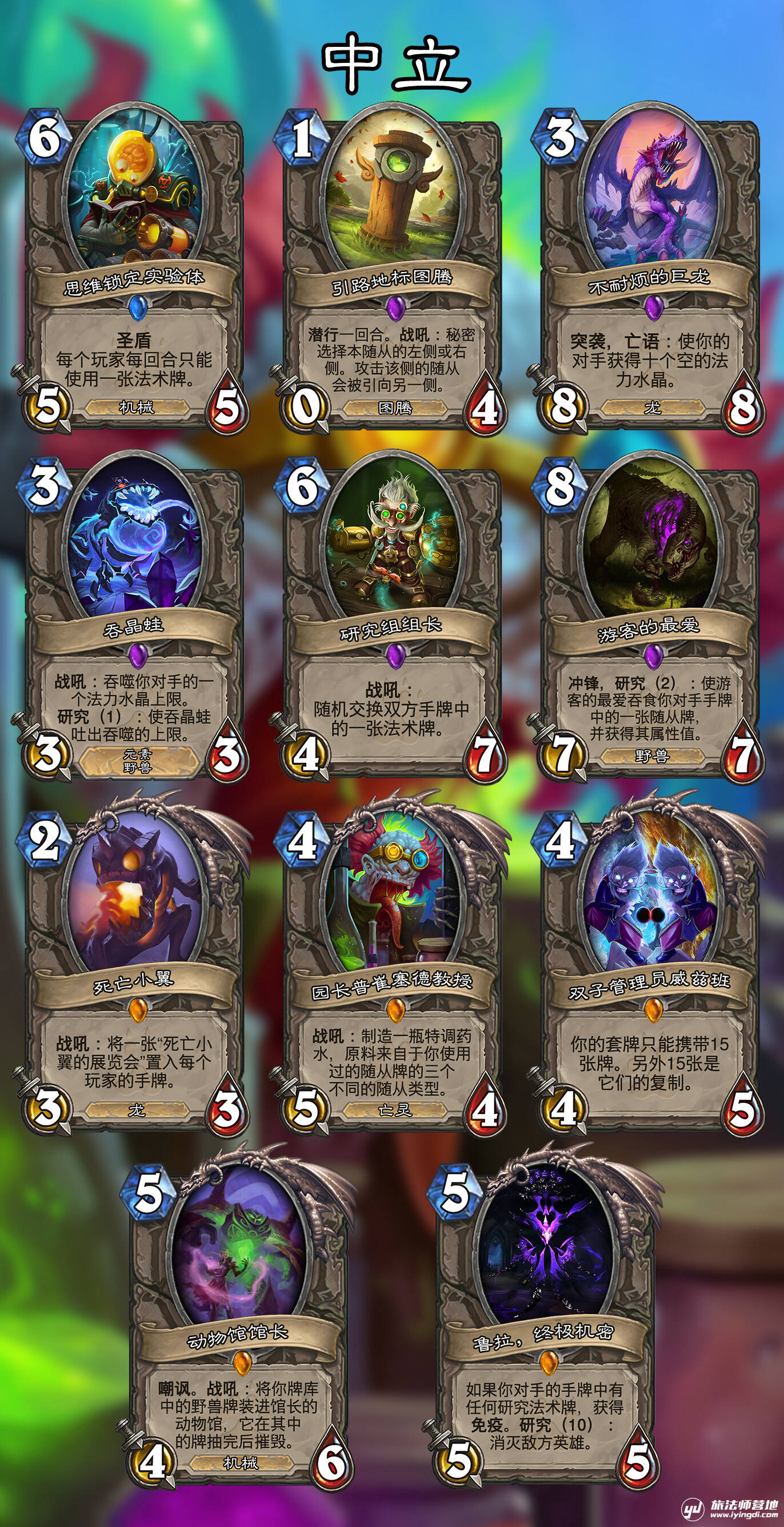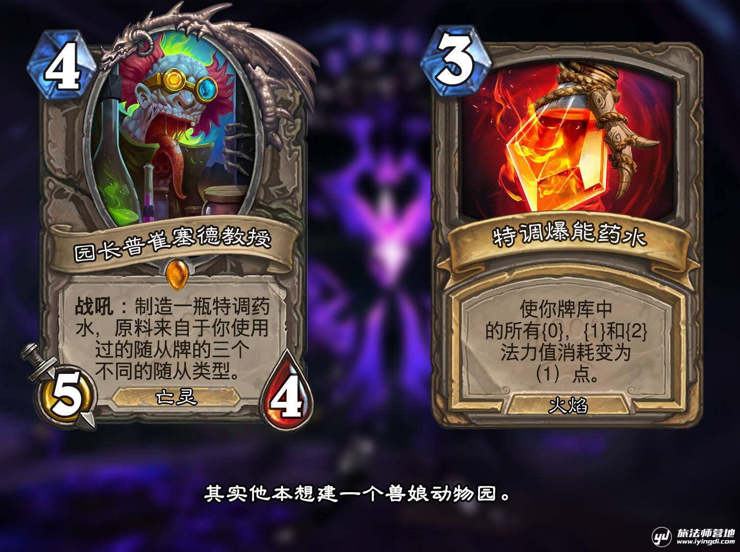 原本的拓展包是想要搞剑走偏锋的架构,即“每个职业各自所有的随从都是完全相同的属性值”这样很有胆创的想法。以此为目标在确立主题时认为动物最贴合这种形式,因此敲定了“普崔塞德教授在一个秘密的地方建造一个动物园”的故事。因为考虑到相同的属性值想做出差异化,可能会出现一些低费用高属性的随从,这时就需要一个负面关键词,“研究”便应运而生。