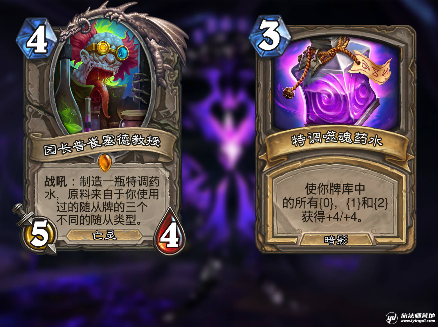 药水中的{0}、{1}、{2}代表你使用过的随从类型。如:你使用过鱼人、野兽、亡灵。那么生成的特调噬魂药水效果是“使你牌库中的所有鱼人、野兽、亡灵获得+4/+4。”