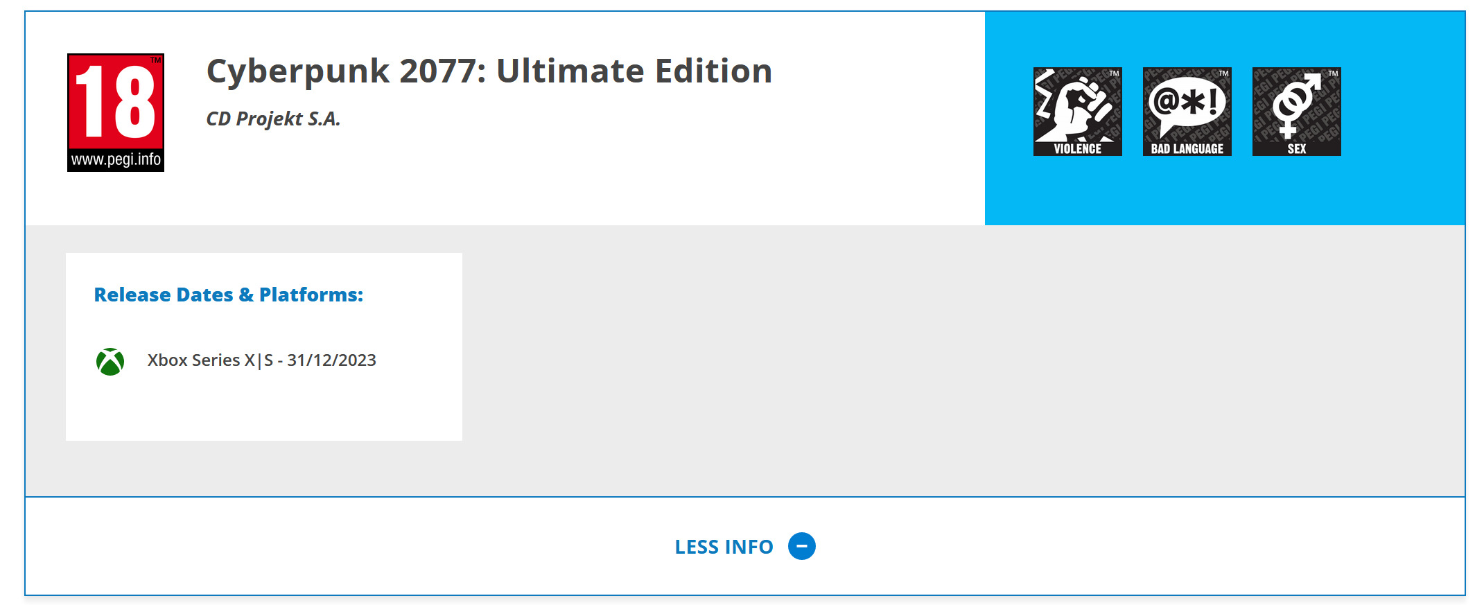 最近,欧洲评级委员会PEGI发布的一份有关《赛博朋克2077》终极版的文件被公开,评级中将Xbox Series X|S 列为发布平台,并将2023年12月31日作为发售日期。值得注意的是,该申请并不意味着它不会登陆PC和PS5等其他平台,发售日期也可能是占位符。