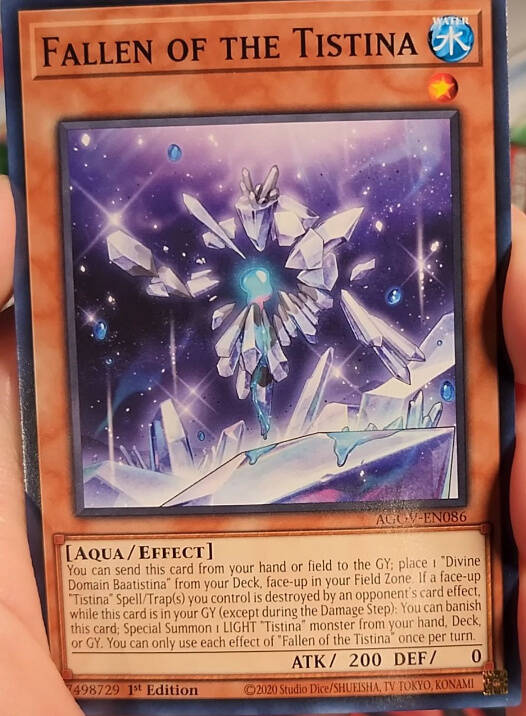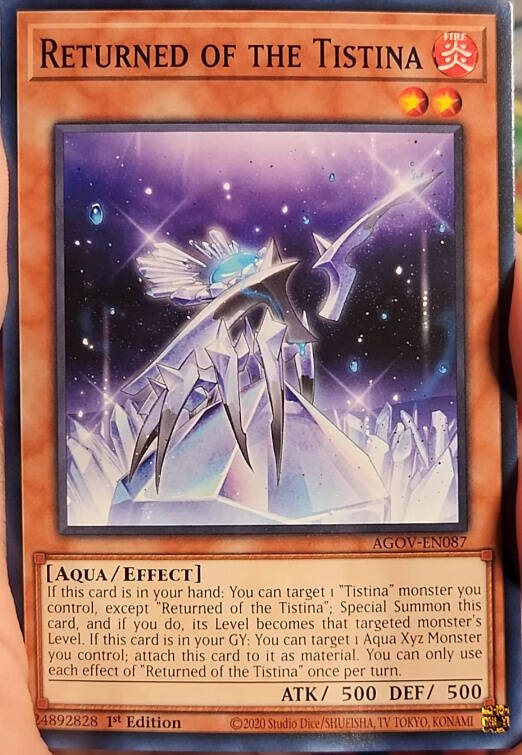 这个卡名的①②效果1回合只能使用1次。①:可以以自己场上的1只「Returned of the Tistina/蒂斯蒂纳的回归者」以外的「Tistina/蒂斯蒂纳」怪兽为对象发动。将这张卡从手牌特殊召唤,这张卡的等级变为与对象怪兽相同的等级。②:这张卡在墓地存在的场合,可以以自己场上的1只水族多维怪兽为对象发动。将这张卡作为对象怪兽的多维素材。