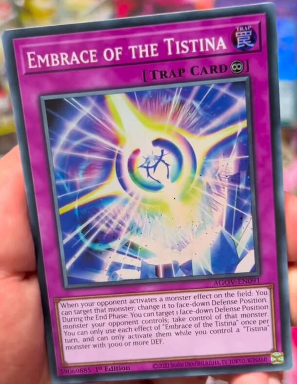 这个卡名的①②效果1回合各能使用1次,只有自己场上有守备力3000以上的「Tistina/蒂斯蒂纳」怪兽存在的场合才能发动。①:对手场上的怪兽的效果发动时,可以以那只怪兽为对象发动。那只怪兽变为里侧守备表示。②:双方的结束阶段,可以以对手场上的1只里侧守备表示怪兽为对象发动。得到那只怪兽的操作权。