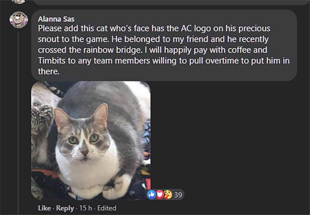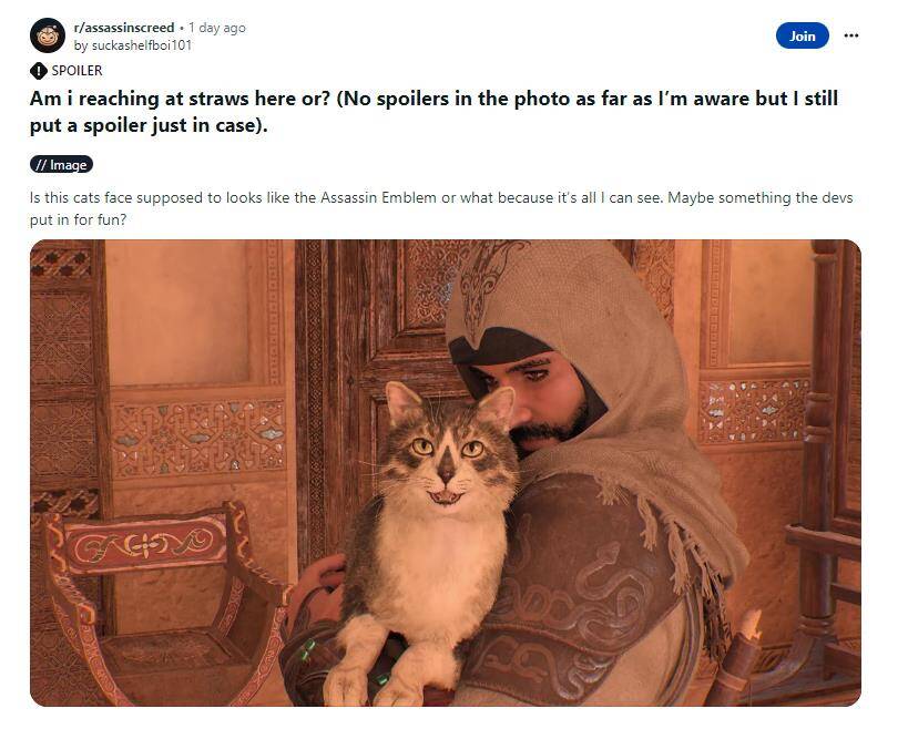 在评论中有玩家证实,这只猫来源自现实中一只真实的猫,“刺客猫”鼻子上的图案与一位粉丝在社交媒体上发布的图案相同,不幸的是,现实中这只猫已经离世了,这位粉丝请求育碧把它加入游戏,看起来育碧实现了粉丝的愿望。