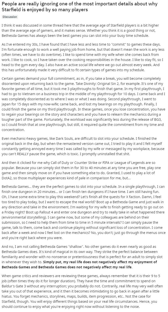 近日在国外Reddit论坛上,一名30多岁的玩家发布了“为何《星空》更受中年玩家喜爱”的文章。作者表示《星空》暂停成本很低,适合空闲时间较为零碎的玩家。